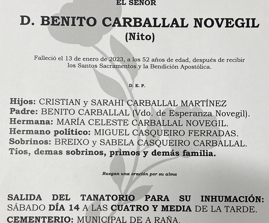 Los restos mortales de Benito Carballal se velan en el Tanatorio San Marcos de Marín de donde saldrán a las cuatro y media de la tarde hacia el cementerio de A Raña donde recibirá cristiana sepultura. La Misa por su alma será el próximo lunes a las cinco de la tarde en la Iglesia Parroquial de San Xulián.