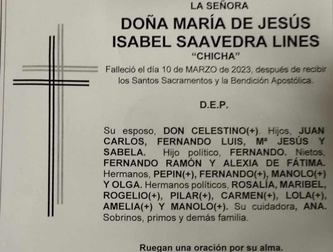 Los restos mortales de Chicha Saavedra se velan en el Tanatorio Alba Marín de donde saldrán a las 12 horas de la mañana de mañana sábado día 11 hacia su incineración en a intimidad familiar. A las cinco de la tarde será la Misa por su alma en el Nuevo Templo parroquial.