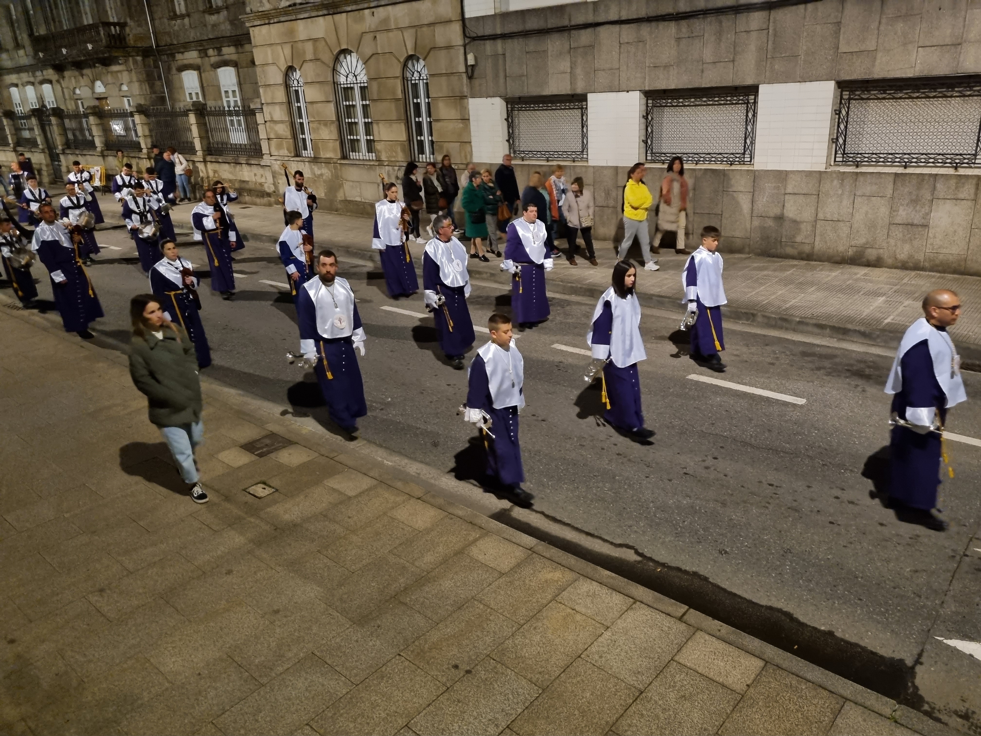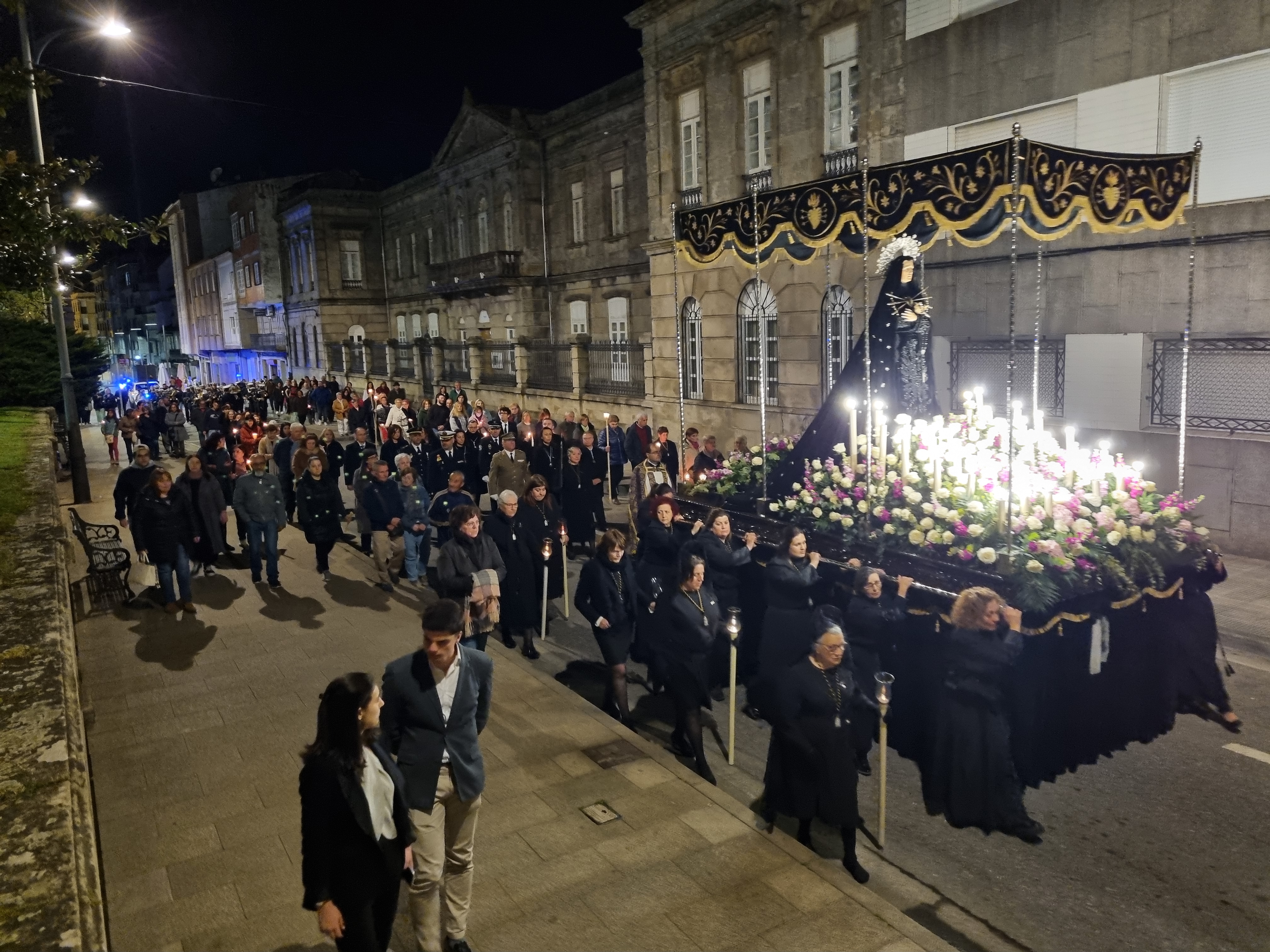La procesión del Santo Encuentro que salió la pasada medianoche fue seguida activa y pasivamente por cientos de personas que, como es tradicional, participaron en ambas comitivas o presenciando desde las aceras su paso y, especialmente en la Plaza de España donde, como es tradicional, fue el punto de encuentro entre las imágenes del Nazareno y de la Virgen de los Dolores, momento especialmente emotivo en el que se guarda un respetuoso silencio antes de que, por un lado la Banda de Tambores cornetas y gaitas del Nazareno y, por otro, la Banda de Música de la Escuela Naval Militar, interpreten sendas piezas adecuadas al acto.