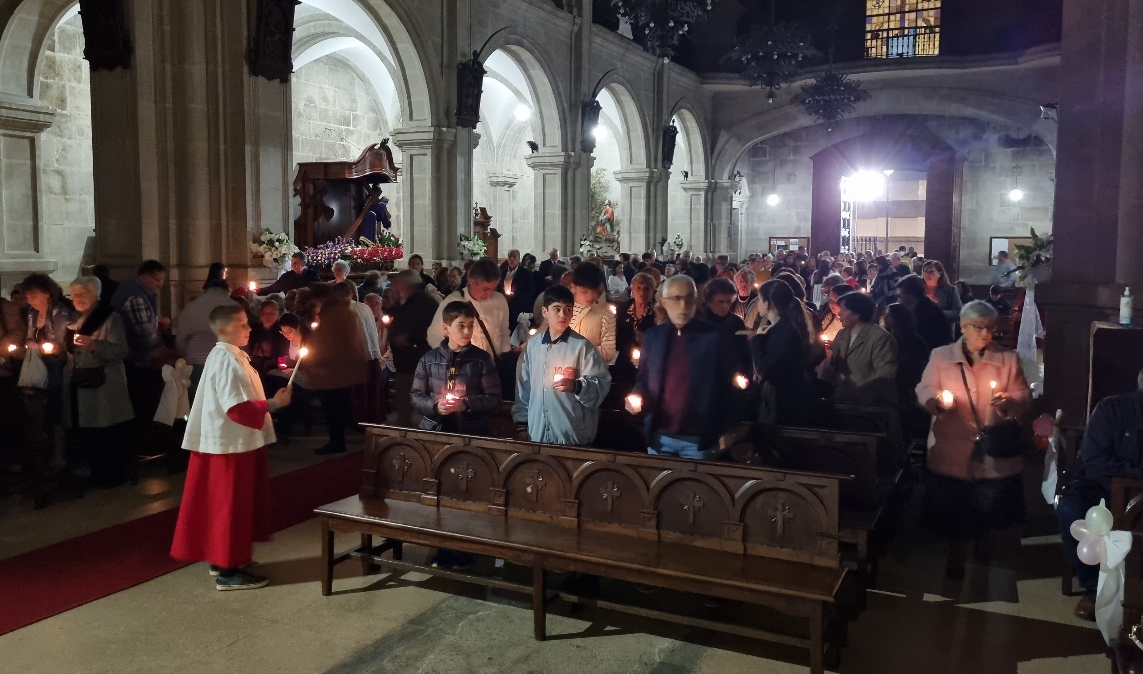 Empezó la reunión en el exterior del templo con el encendido del fuego que alimentó las velas de los asistentes que se trasladaron al interior a continuación para iniciarse la ceremonia de la Resurrección que contó con el coro parroquial y con un abarrotado templo para seguir con mucha participación las evoluciones de la liturgia establecida.