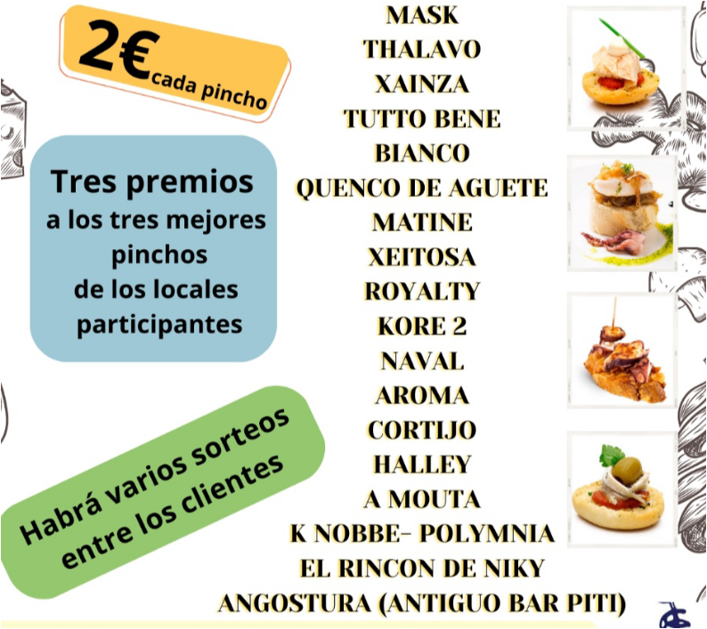 Participarán 18 locales y los pinchos serán valorados y puntuados por los profesores del colegio de hostelería Carlos Oroza estando el jurado estará compuesto por: Noa Seijo, Ana Area y, Anxo Souto