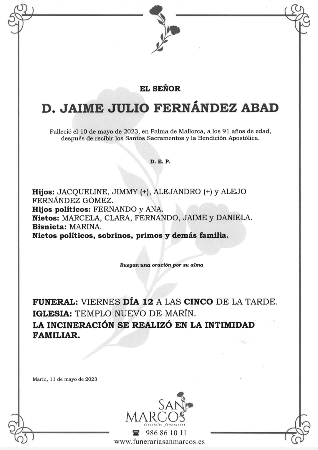 Los restos mortales de Jaime J.Fernández Abad fallecido el pasado miércoles en Palma de Mallorca han sido incinerados en su lugar de residencia y parte de us cenizas llegarán a Marín en breve para ser incorporadas al panteón familiar en el cementerio de A Raña.