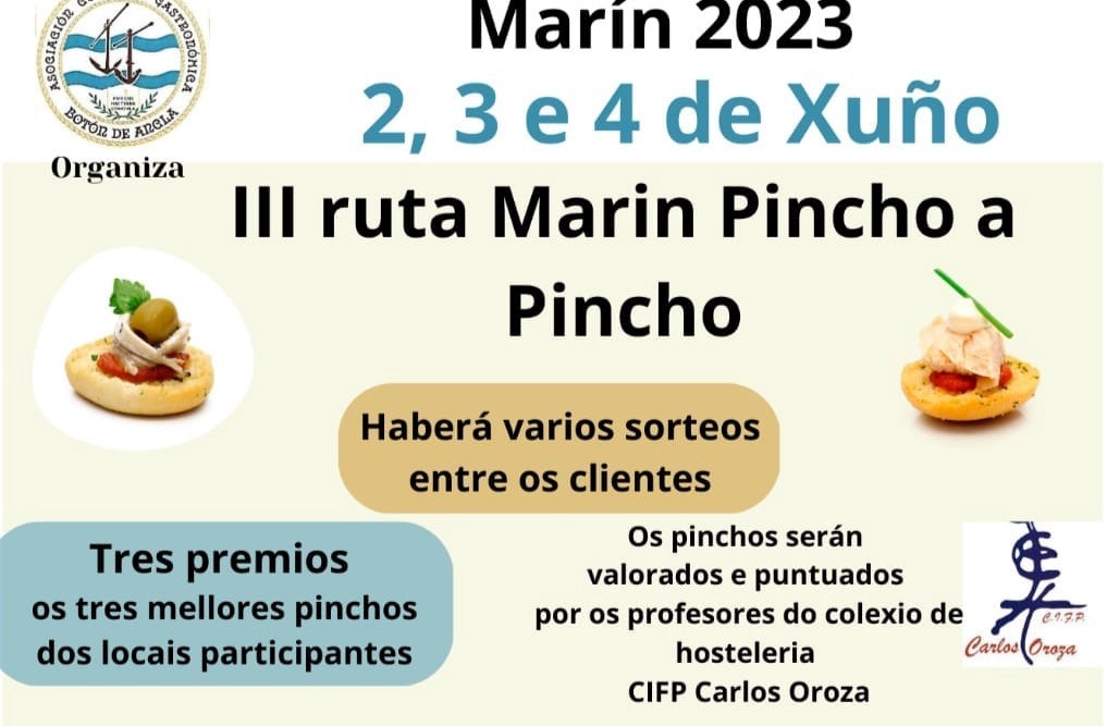 En esta tercera edición de la Ruta 'Marín, Pincho a Pincho' participarán dieciocho establecimientos hosteleros de Marín, capital, y Seixo, que presentarán a concurso y a la degustación de sus clientes sus pinchos representativos que se pondrán degustar los tres días del evento de 12 a 15 horas y de 19,30 a 22 y media de la tarde-noche, al precio de 2 euros la unidad. Los pinchos de todos los locales serán evaluados por un jurado compuesto por profesores de la Escuela de Hostelería Carlos Oroza, que serán los encargados de decidir quiénes serán los merecedores de los tres premios, consistentes en unos viajes, y trofeos para los mejores en cuanto a proporcionalidad, originalidad, calidad, presentación y sabor.