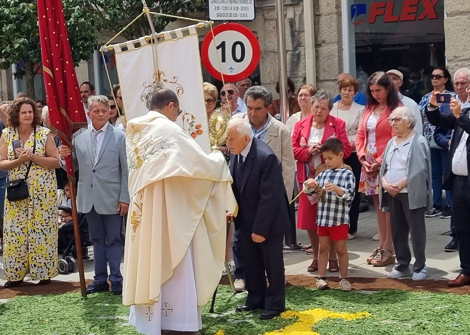 Fue aquí donde, antes de reiniciar la marcha hacia el antiguo templo, el sacerdote procedió a acercar el Santísimo a personas de movilidad reducida que se encontraban en el lugar, momento que resultó de especial emotividad para los presentes.