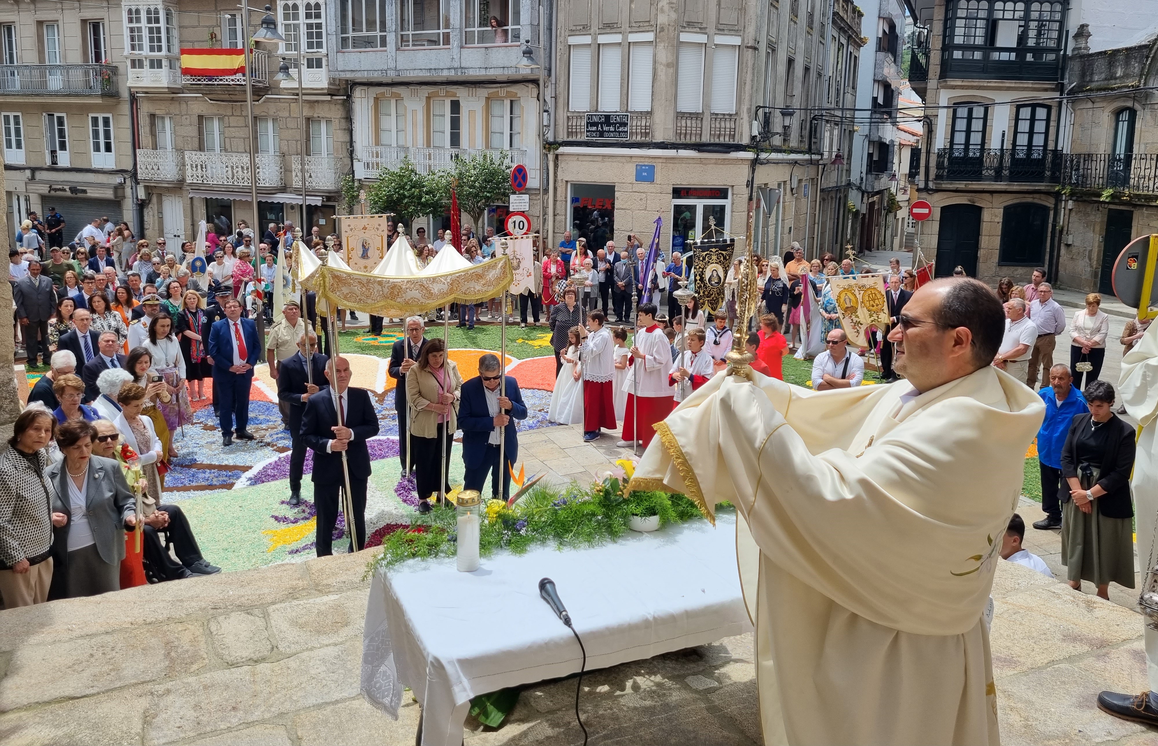 La principal parada se efectuó pocos metros antes de finalizar el recorrido en plena Plaza del Reloj donde se dispuso el último de los altares desde el que el párroco portador del Monumento, realizó la última de las bendiciones ante los asistentes que se encontraban sobre una de las magníficas alfombras.