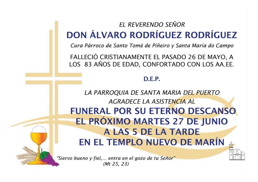 Don Álvaro Rodríguez, cura párroco de Santo Tomé de Piñeiro pero estrecho colaborador de la feligresía de Marín-centro, falleció el pasado 26 de mayo cuando contaba con 83 años de edad y tras no superar las dolencias que le aquejaban.