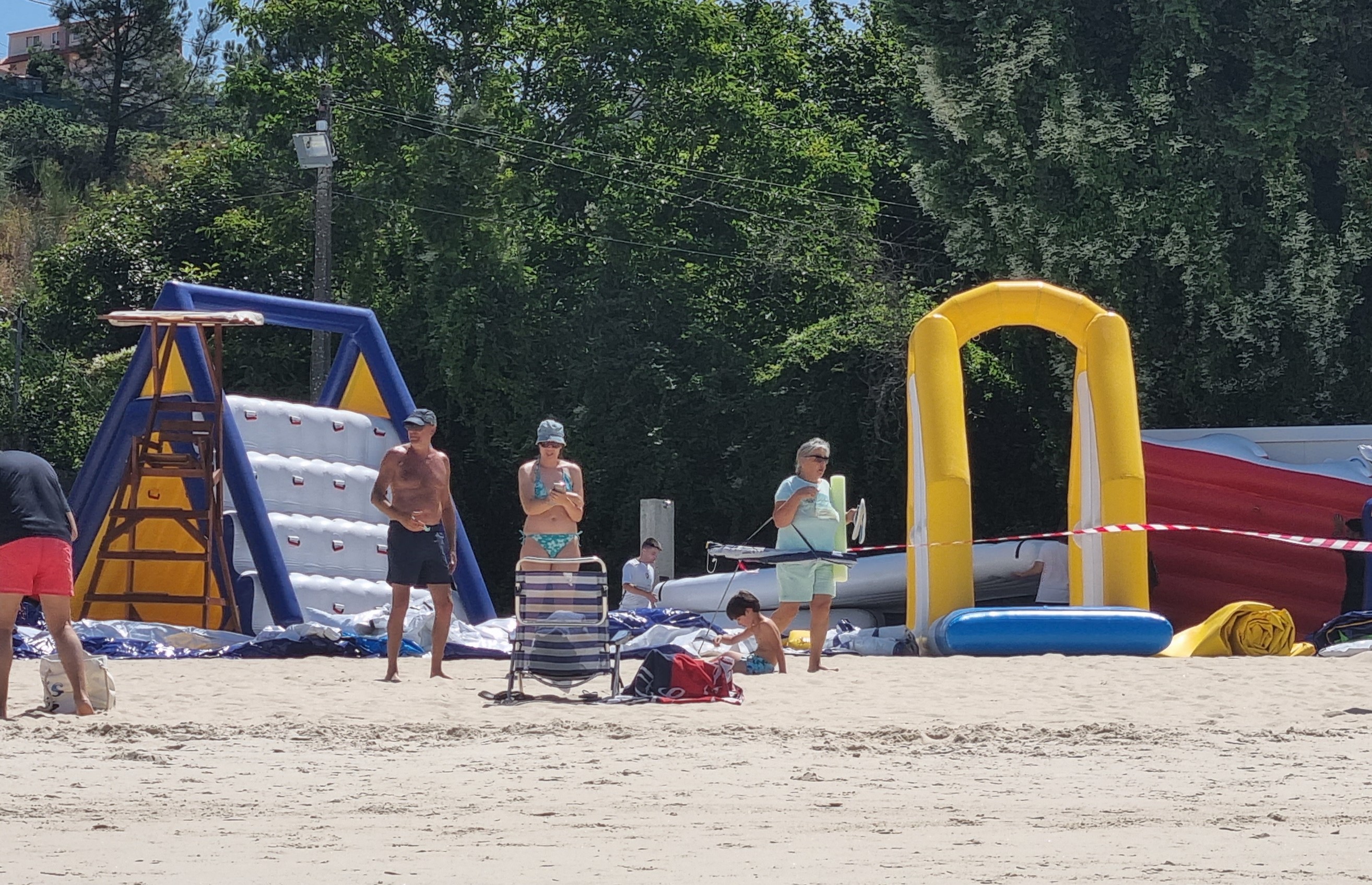 Ayer se inició la instalación del aquapark en la Playa de Mogor con gran espectación de los bañistas que vieron como se iban trasladando pieza a pieza los elementos que componen la estructura flotante que ocupará 800 metros de lámina de agua
