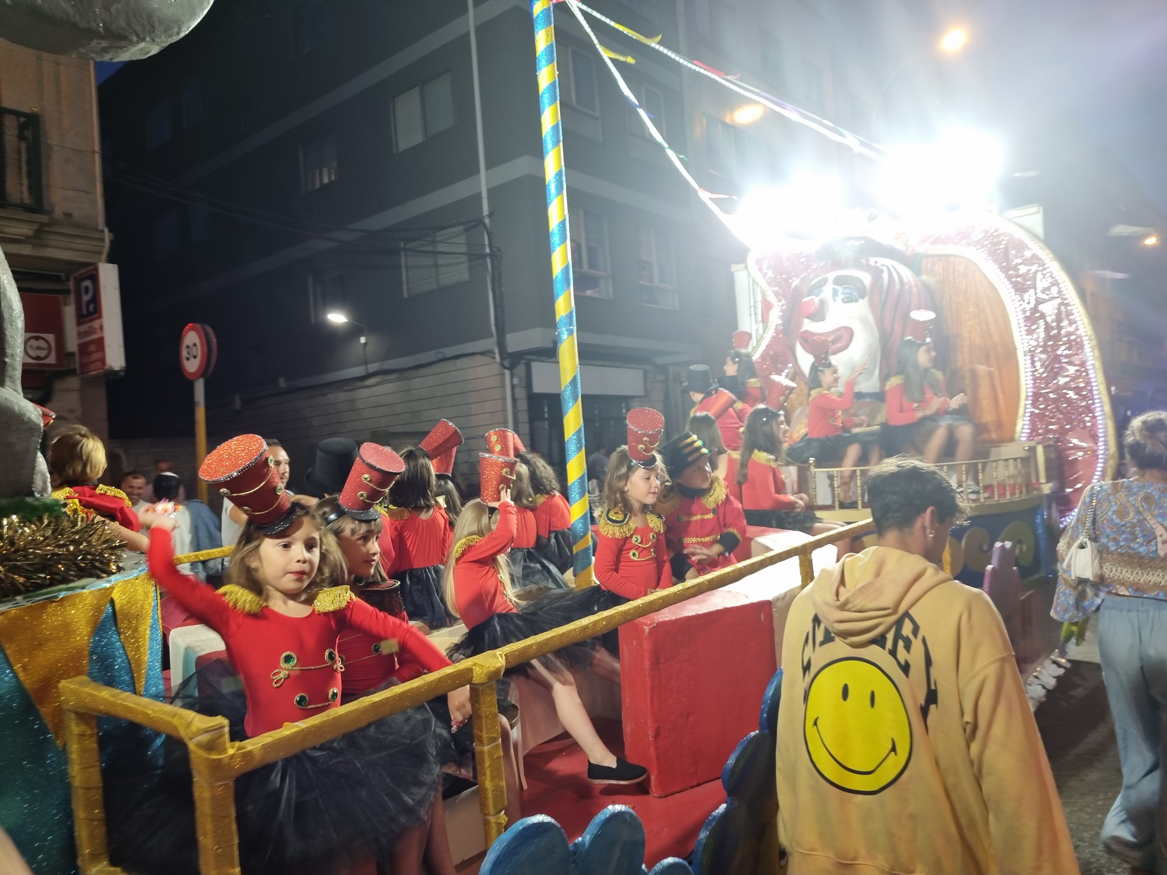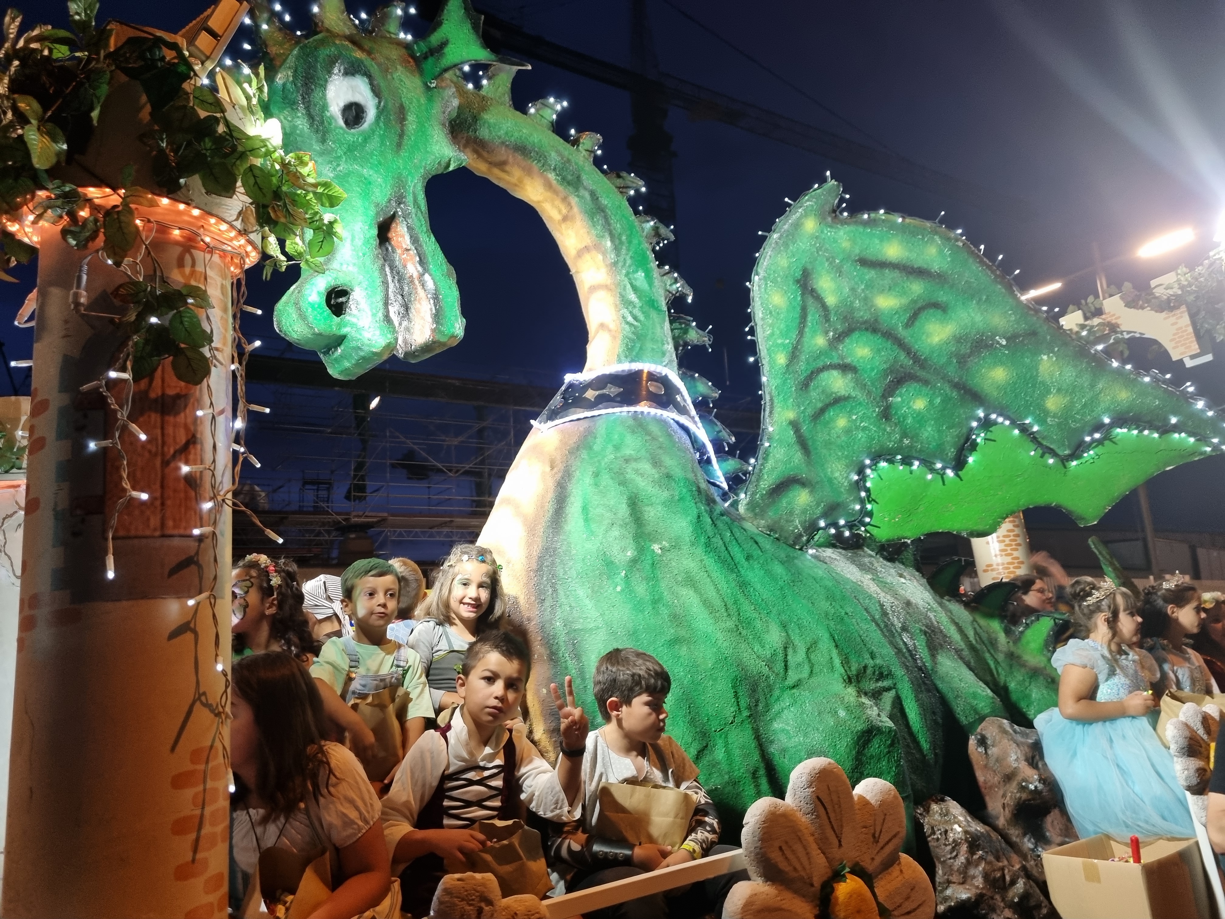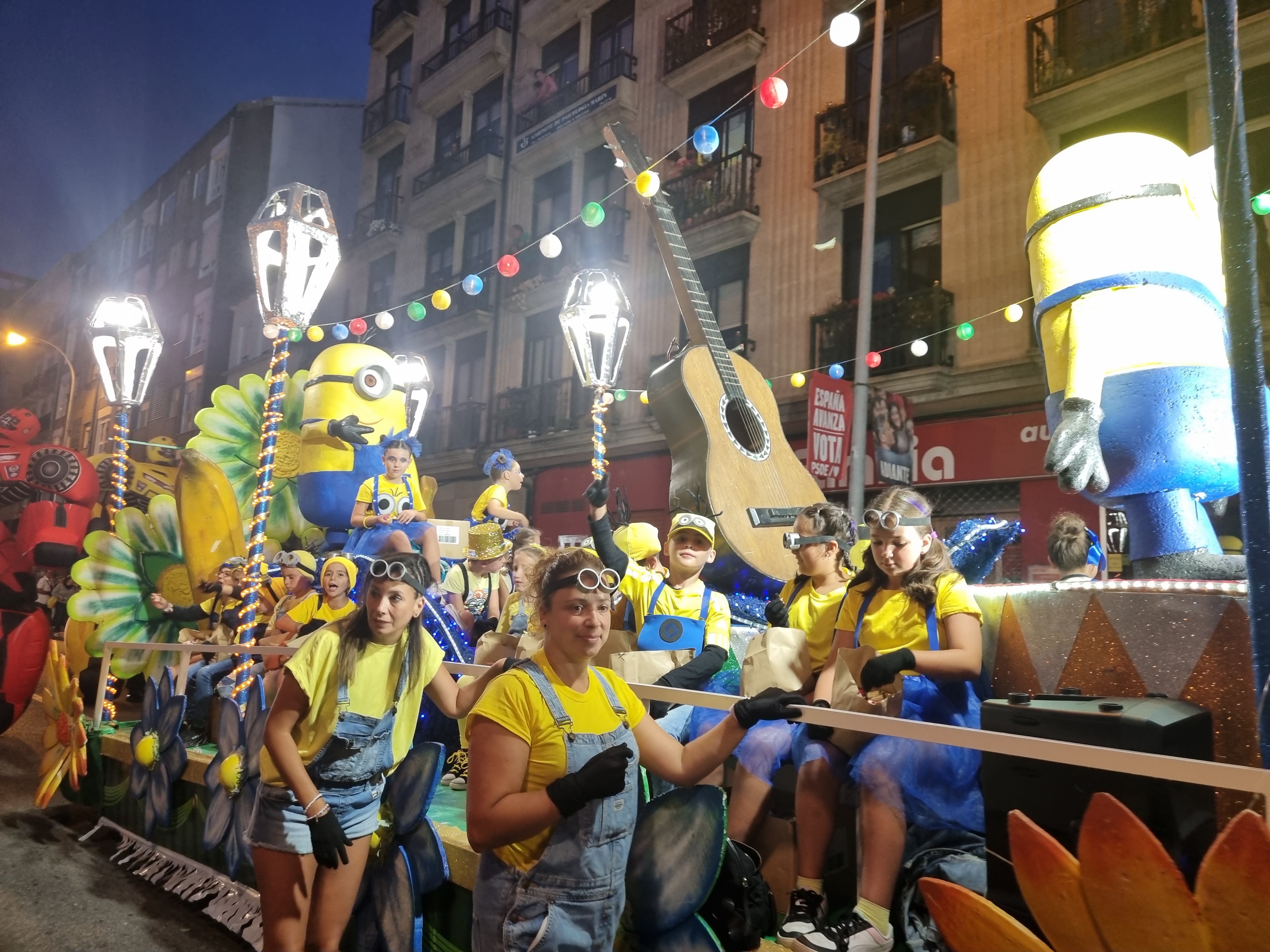 por cierto un nombre inapropiado porque ni lleva una sola flor ni se lanza un solo pétalo y debería llamarse batalla de caramelos porque, al margen de la vistosidad de las carrozas que formaban parte de la comitiva, hubo cientos de kilos de caramelos por el aire lanzados desde los distintos motivos rodantes que componían la “batalla” y los niños y niñas, pero también muchos mayores, recogían con verdadera fruición aunque el dispositivo de seguridad formado por números voluntarios, ataviados o no con los motivos de cada carroza, trataban y lo consiguieron, impedir peligros que se viven en este tipo de comitivas sobre todo cuando hay caramelos que caen a la carretera por donde circulan los vehículos engalanados.