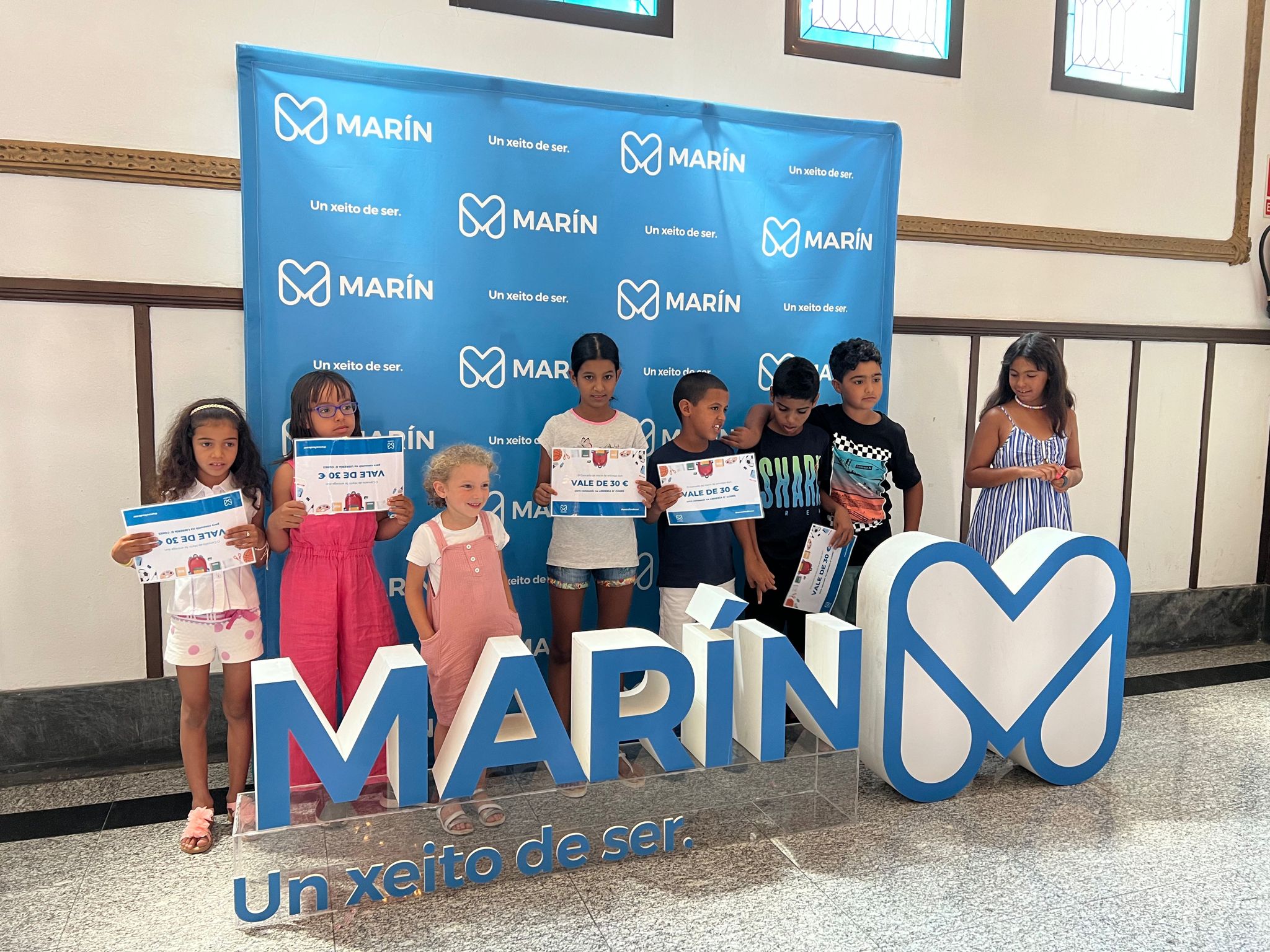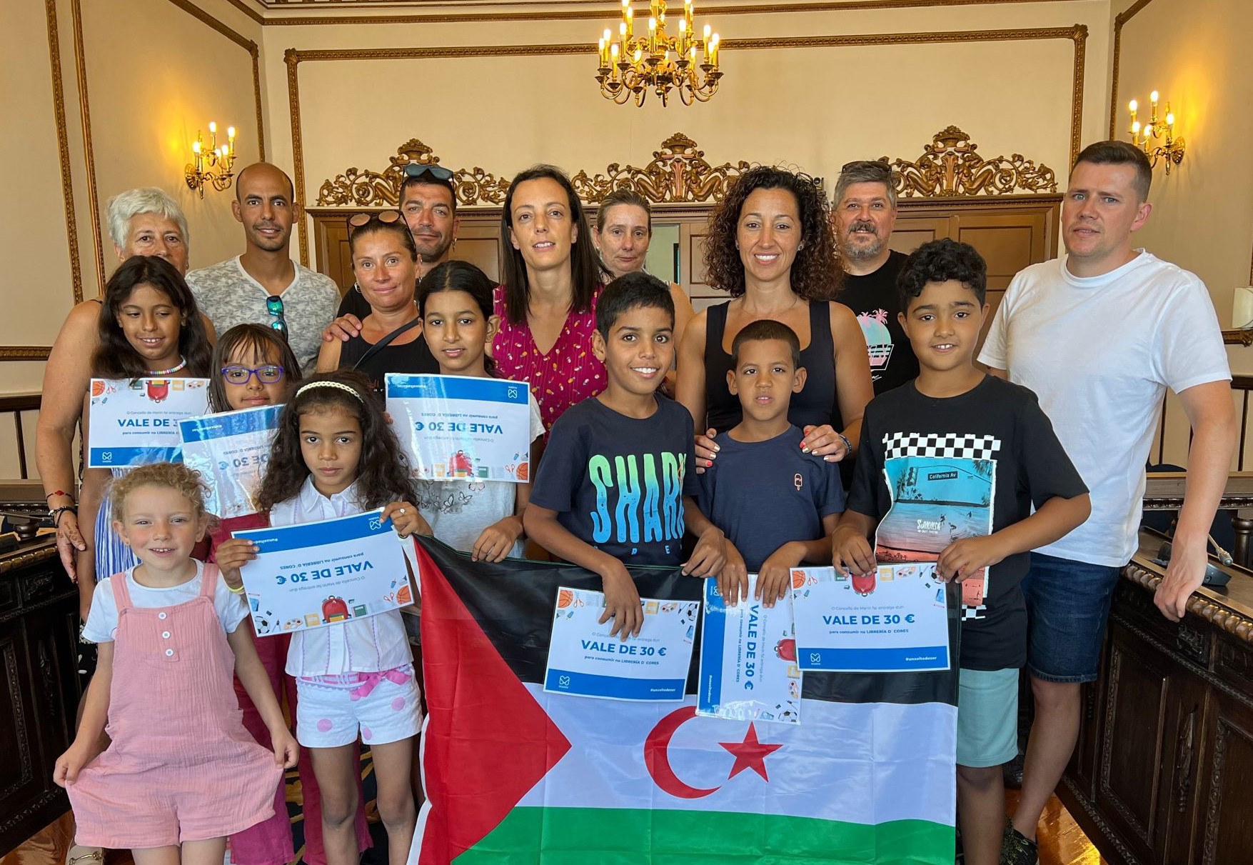 Marián Sanmartín procedió entonces a dar como obsequio de bienvenida a cada uno de los chavales saharauis un cheque regalo que podrán gastar en una conocida papelería de Marín.