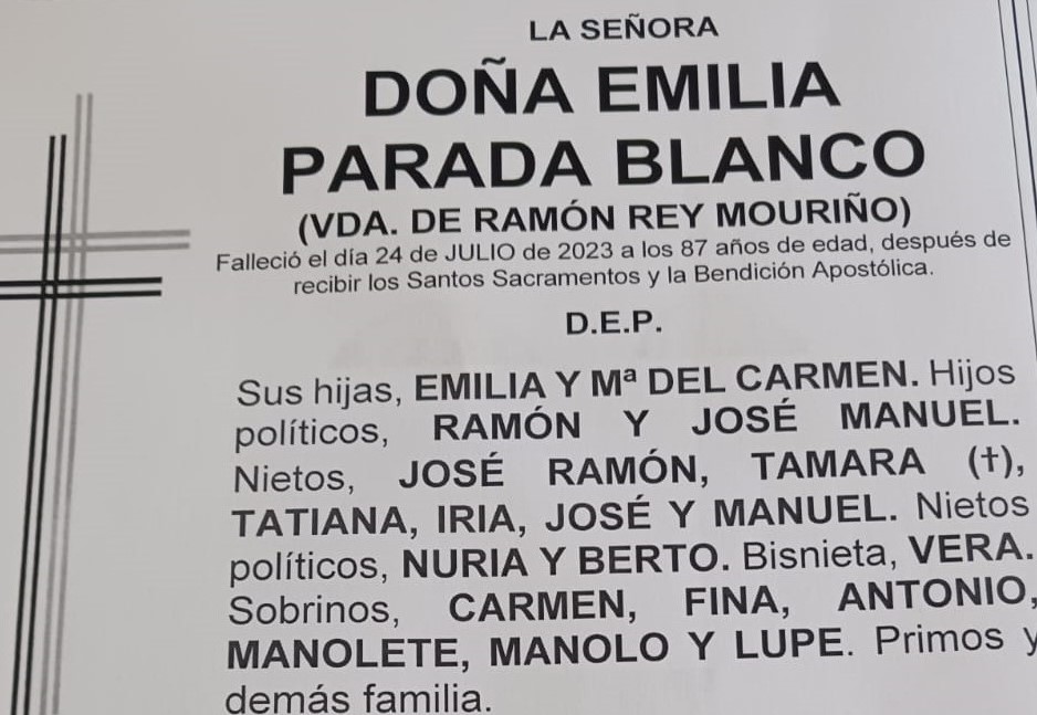 Recibimos la triste noticia del fallecimiento de la vecina de Seixo, Emilia Parada Banco, a los 87 año de edad tras no superar los padecimientos de los últimos meses que sobrellevó con resignación cristiana.