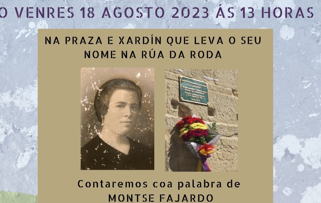 Hoxe venres día 18 lembramos a Carmen Pesqueira Domínguez "A Capirota" na praza e xardín que leva o seu nome, na rúa da Roda. No acto, organizado pola ARMH de Marín e que comezará ás 13:00 h., intervirá Montse Fajardo, xornalista, escritora, investigadora e responsable técnica do Departamento de Memoria Histórica da Deputación de Pontevedra até o pasado mes de xullo, e contaremos co acompañamento musical de A Revolta.