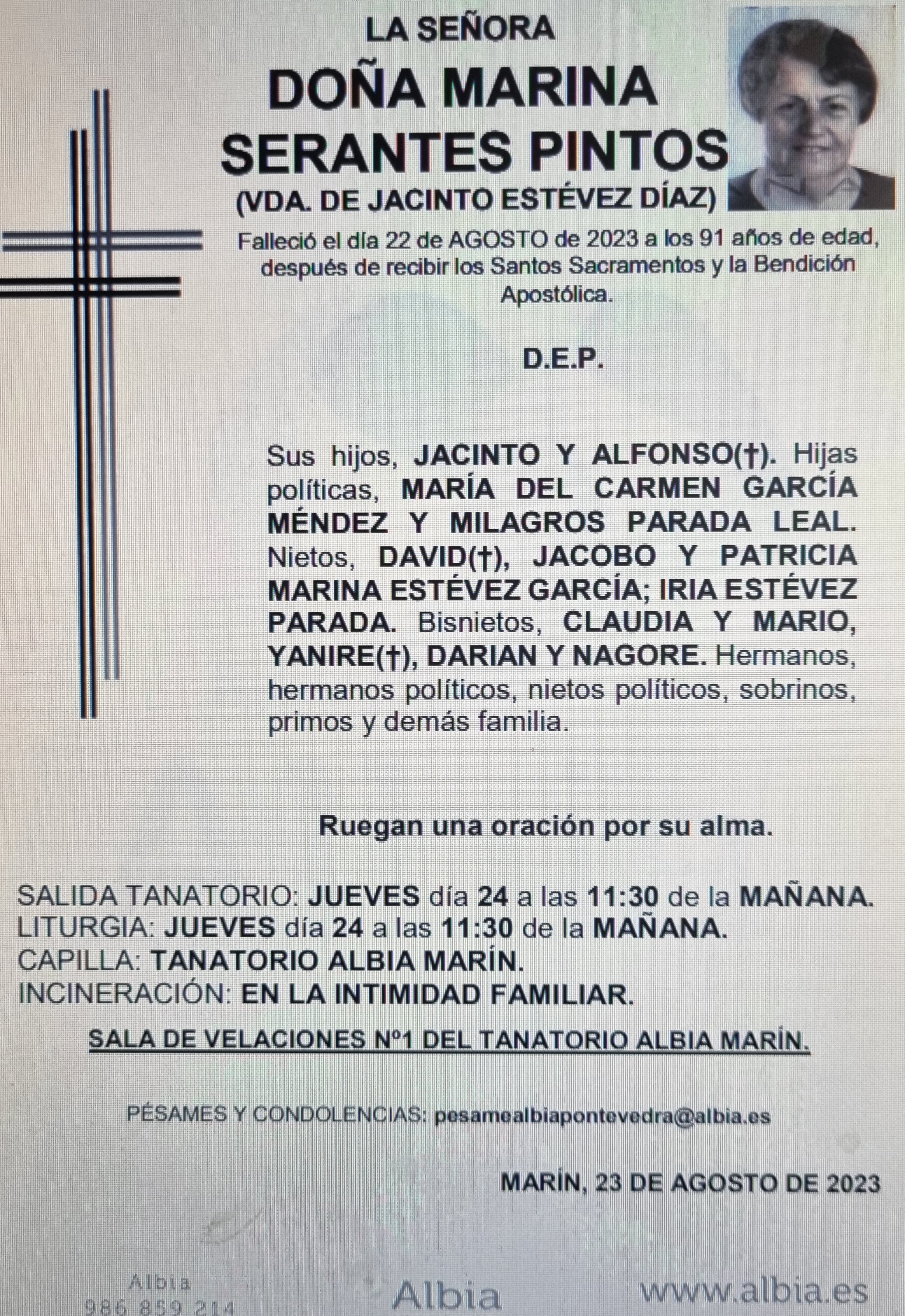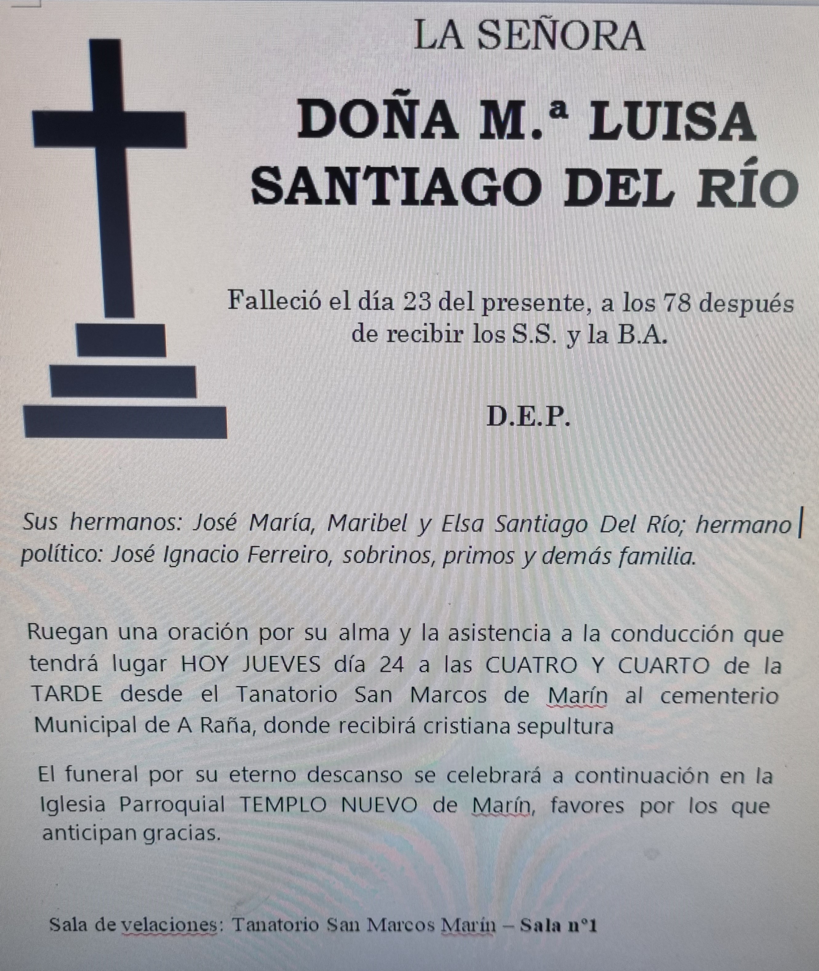 Los tanatorios de San Marcos y Albia de Marín acogen los restos mortales de María Luisa Santiago y Marina Serantes cuyas esquelas acompañamos a continuación. Descansen en paz.