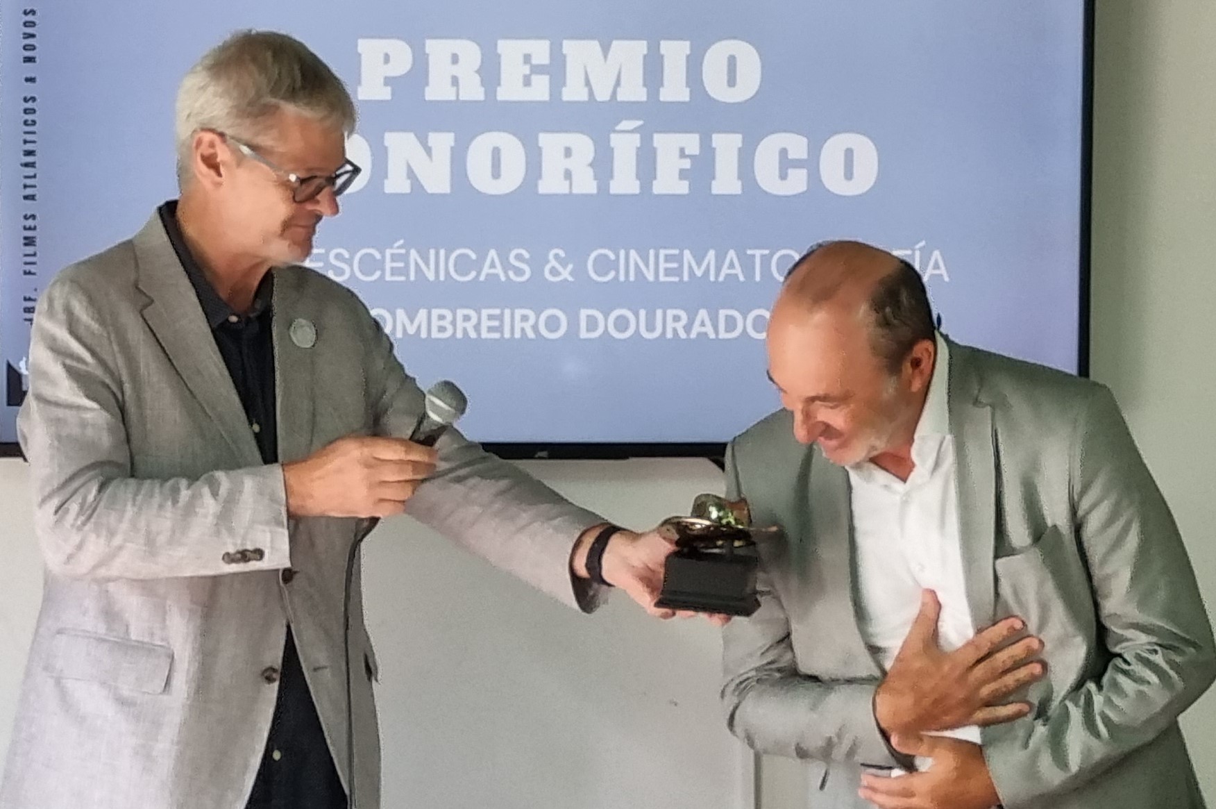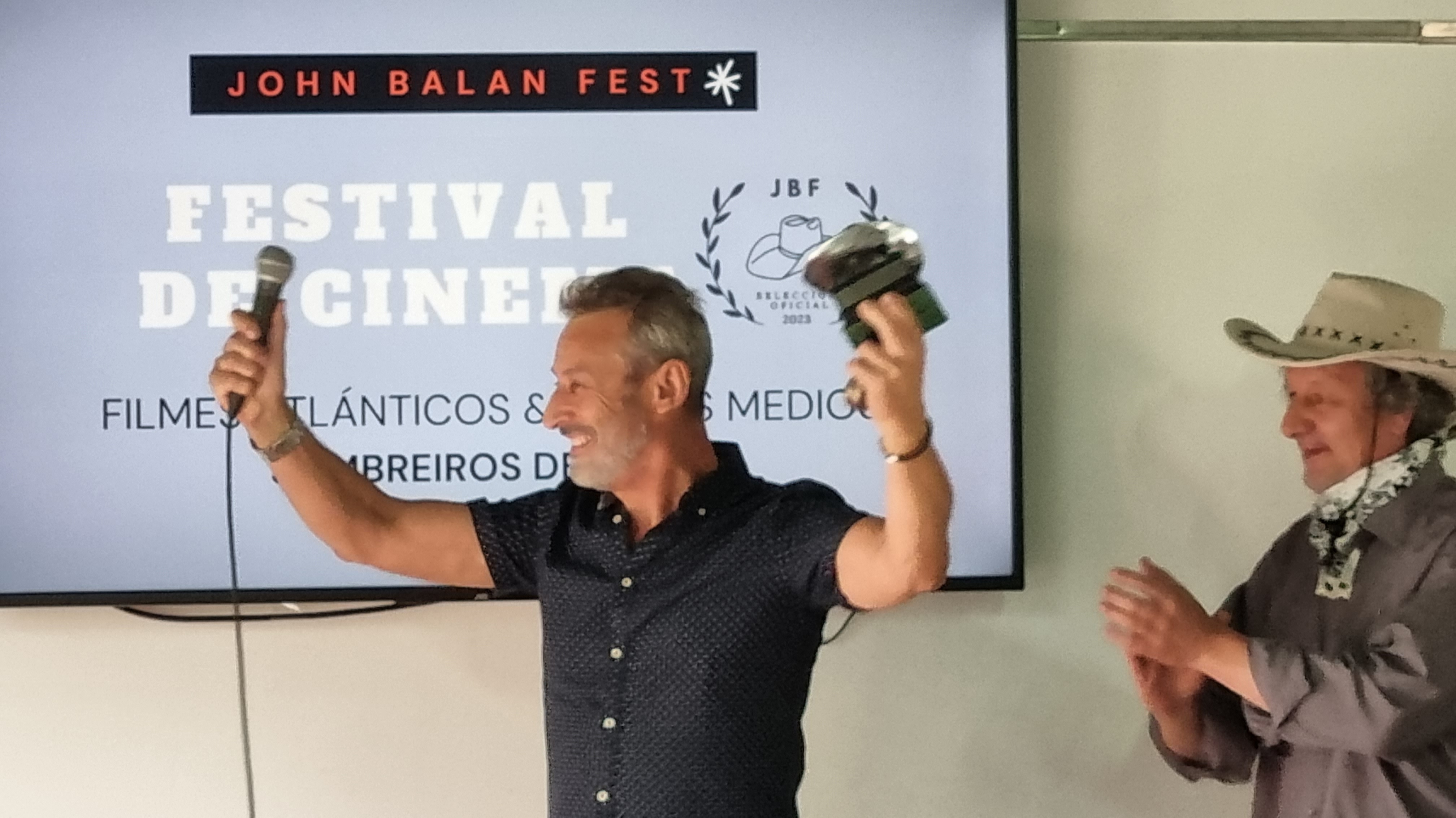 Es curioso ver como hay ocasiones que superan hasta a los más acostumbrados a estas cosas. Cabe destacar el acierto del festival al conceder a Manuel Manquiña el premio especial de la jornada y del festival para destacar su trayectoria en las artes escénicas y cinematográficas. El actor, cuando fue llamado, subió al estrado y dedicó unas palabras de ánimo y felicitación a los organizadores del festival al que deseó larga vida. Tuvo una especial referencia a sus compañeros y, sobre todo a su familia, empezando por su esposa allí presente, a la que reconoció gran parte de su realidad artística por ser la que pone orden en la vida familiar soportando las largas ausencias que muchas veces se producen por mor de su trabajo y, ya al término de su breve pero intensa exposición, con el sombrero dorado en la mano, hizo una referencia a John Balan con la voz entrecortada por la emoción lo que fue recogido por los asistentes con muchos aplausos.