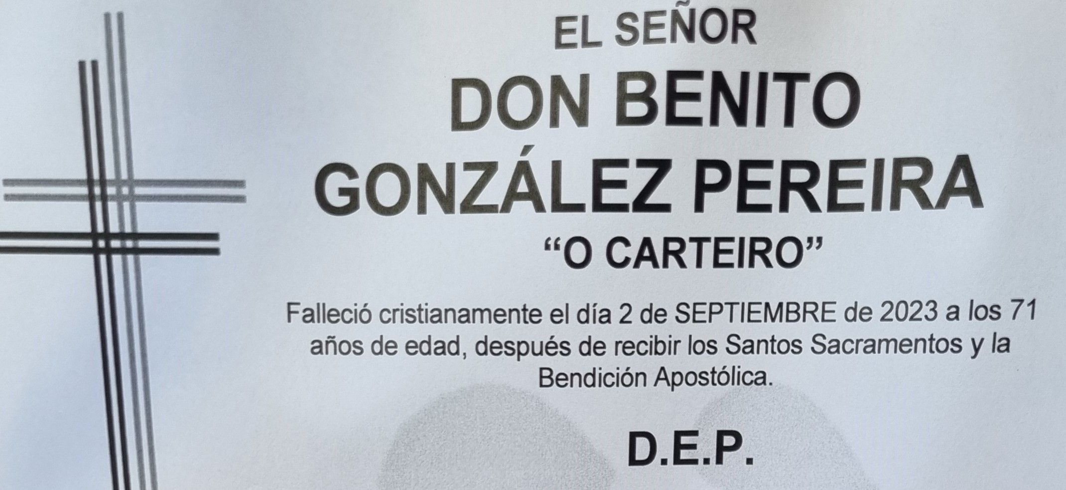 A las numerosas condolencias que reciben los familiares del fallecido, su esposa Marta; sus hijos Diego/Olalla y Noelia/Antonio, nietos y demás familia, unimos las de quienes hacemos esta Carriola y de forma especial a su hijo Diego, edil de nuestro ayuntamiento y animador deportivo de este municipio en el que desarrolla una importante labor en ese ámbito, no en vano es el fundador y presidente del club de atletismo "Pinarium"..