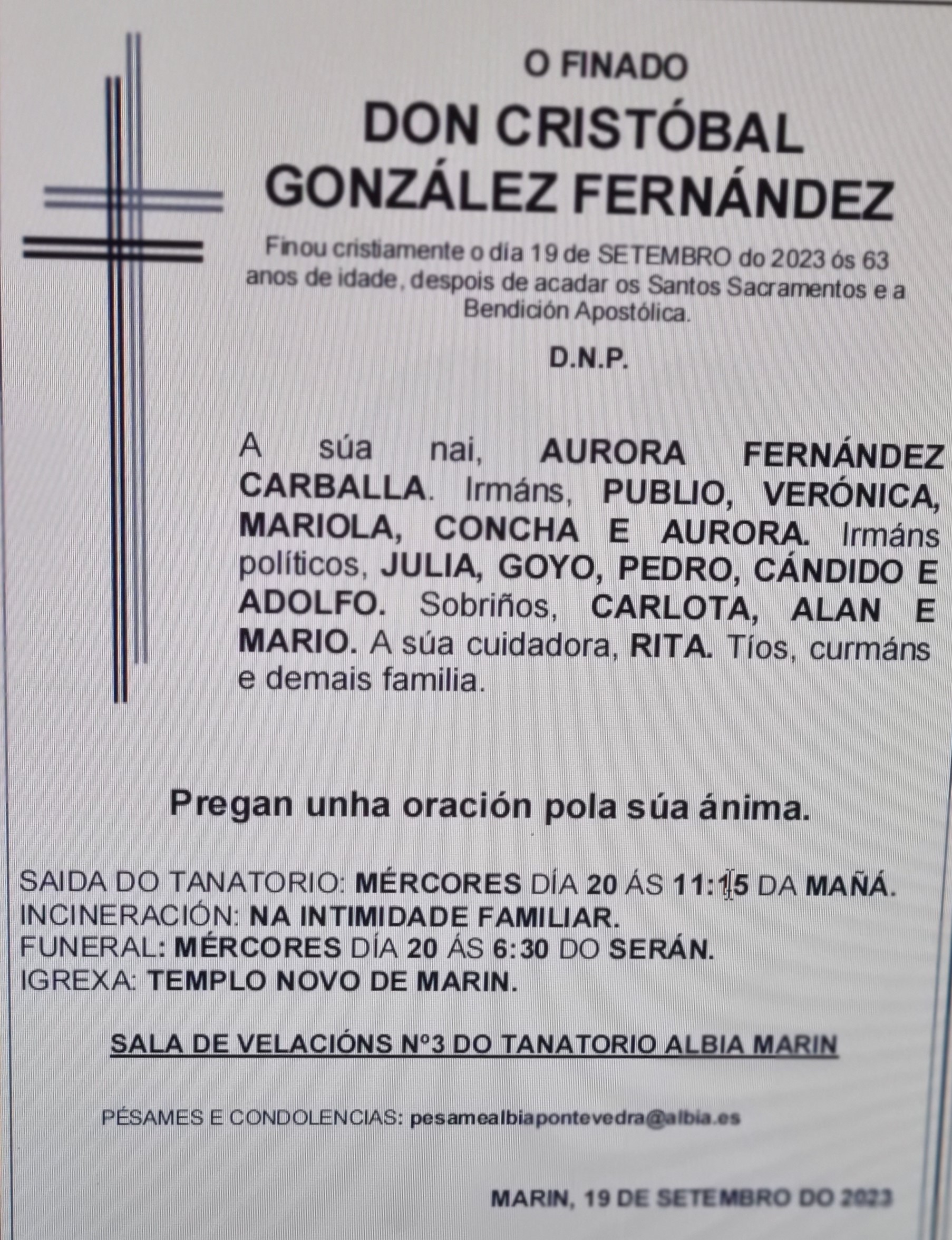 La Funeraria Albia comunica que en la sala número 3 de su Tanatorio en Marín se velan los restos mortales de Cristóbal González Fernández, fallecido hoy cuando contaba con 63 años de edad. Mañana miércoles día 20 a las 211,15 de la mañana saldrán hacia su incineración en la intimidad familiar y, por la tarde, a las 18,30 en el Nuevo Templo, se oficiará la Misa por su alma. Descanse en paz.