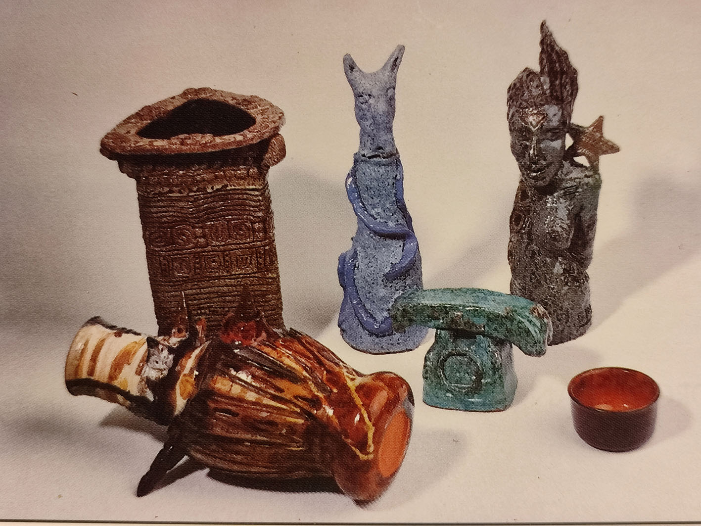 Corresponden las imágenes a un pequeño folleto de la asociación anunciando una exposición del obradoiro, en el que se dice textualmente "As pezas que compoñen esta mostra son o froito dunha continua investigación e desenrolo de puntos que compoñenunha programación básica deseñada polos monitores de alfarería e de escultura e cerámica, baseadas den aspectos de deseño, creatividade, (enerxía persoal do autor), e a coor a través dos esmaltes. Unha vez máis con esta mostra preténdese reforzar a idea do "Obradoiro como centro de actividade social e como centro de investigación no campo da cerámica na comunidade de Marín".