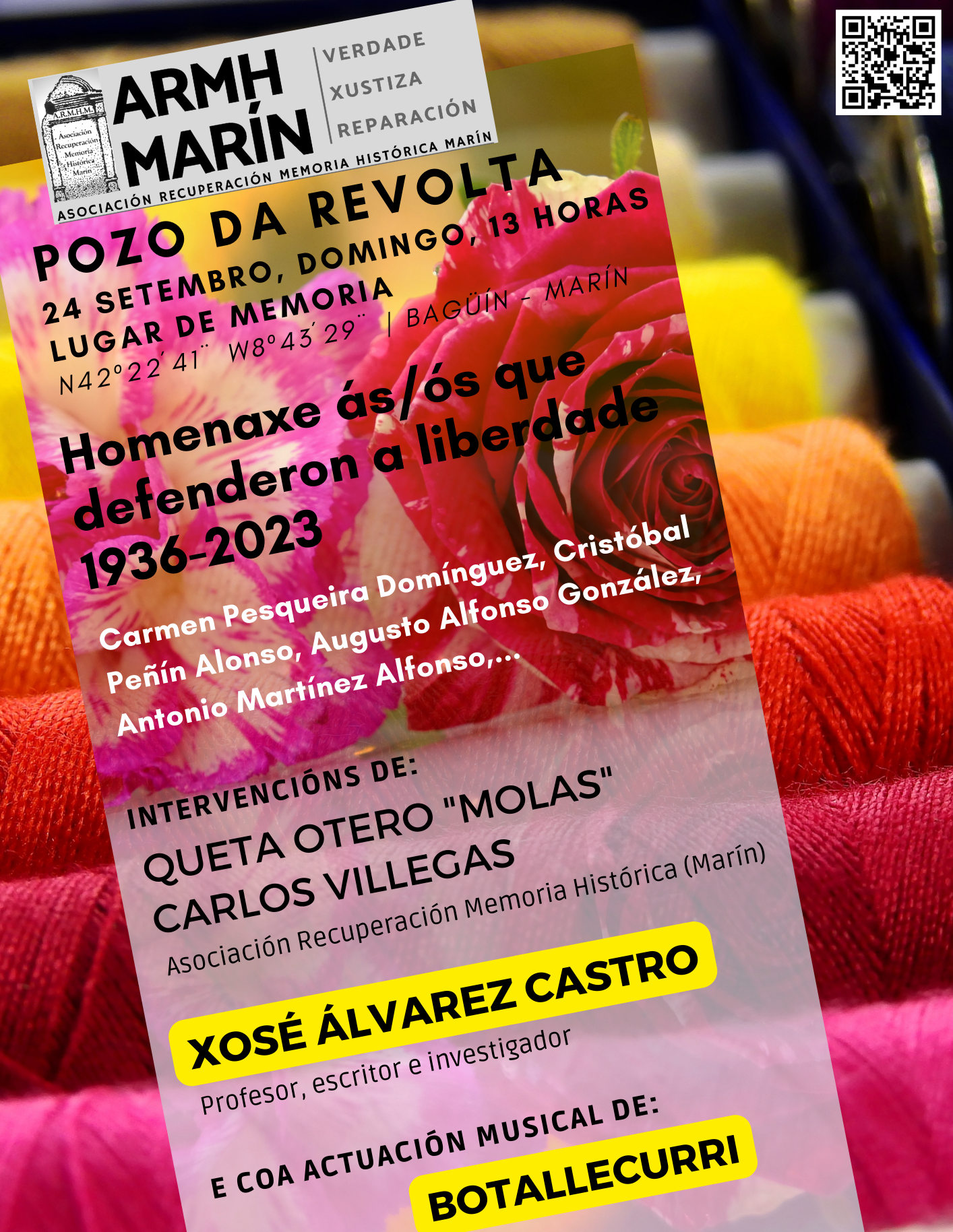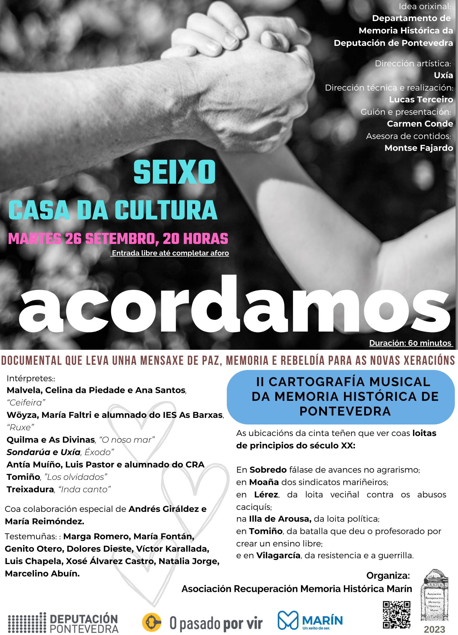 Por outra banda, entro dos actos deste mes de setembro, o martes, día26, proxectarase o documental Acordamos, na Casa da Cultura de Seixo ás 20:00 h.. O documental, que é unha idea orixinal do Departamento de Memoria Histórica da Deputación de Pontevedra, quere ser unha mensaxe de paz, memoria e rebeldía para as novas xeracións. A dirección artística é de Uxía, a dirección técnica e realización de Lucas Terceiro e o guión e presentación de Carmen Conde, contando con Montse Fajardo como asesora de contidos.