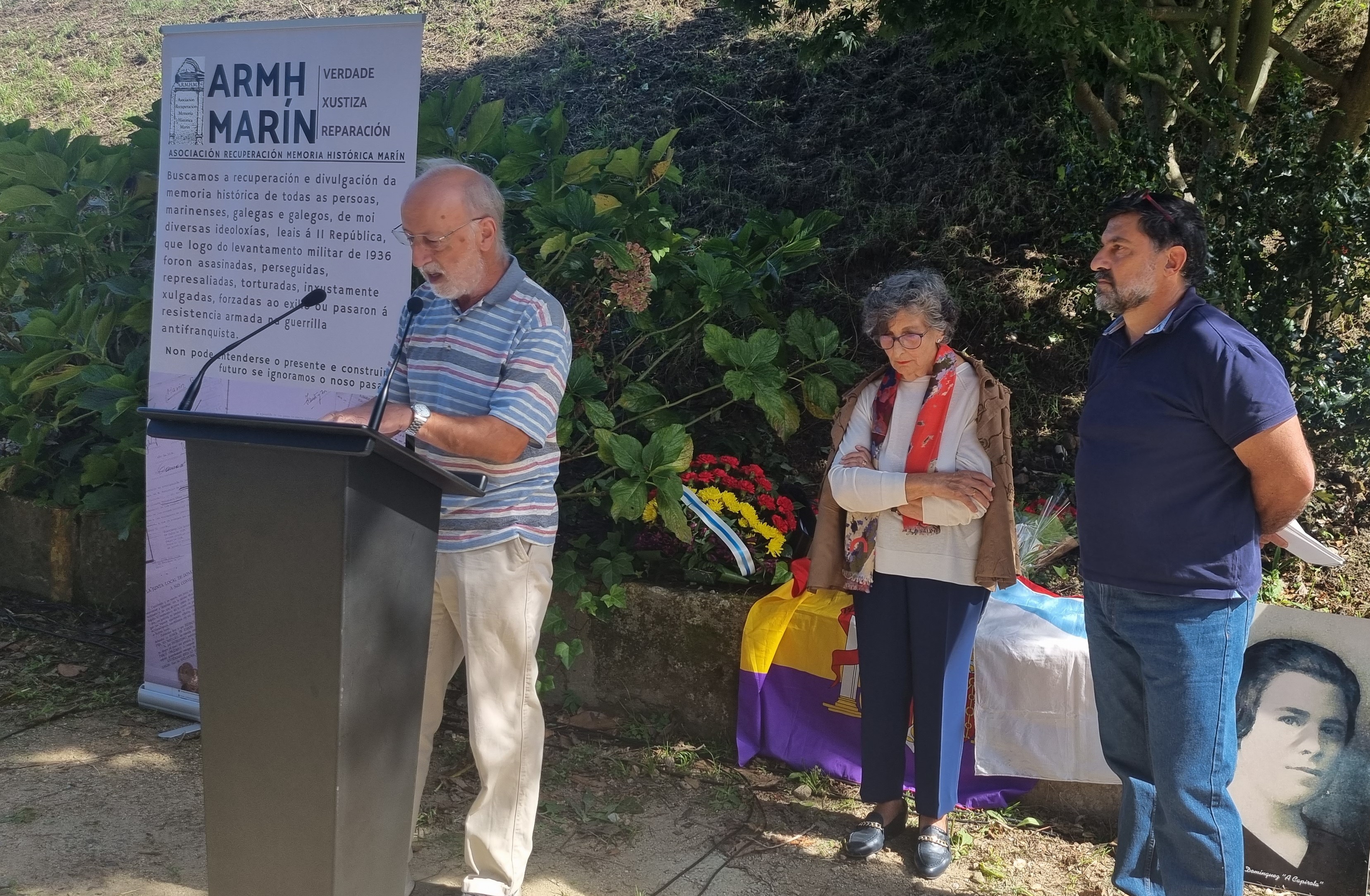 El profesor e investigador Xosé Álvarez Castro pronunció unas palabras motivadas por el acto que se celebraba y dirigió su contenido no solo a recordar a las personas fallecidas por la represión, sino a los autores de la misma, enumerando y nombrando a varios de ellos con responsabilidades políticas o militares o, falangistas como los que, en el caso de Marín, se dedicaron a las órdenes del mal recordado “Alemán” a “pasear” a sus víctimas dejando tras de si el reguero de sangre y luto para sus familias.