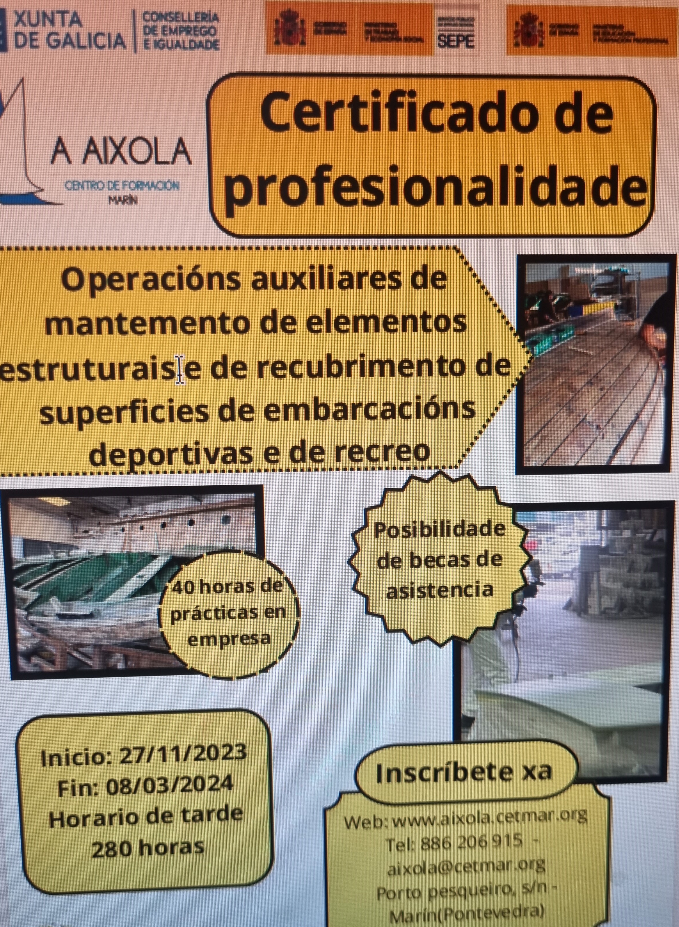 O Centro de Formación “A Aixola” ubicado no interior do Porto de Marín convoca unha serie denovos cursos próximos a iniciar nas súas instlacións dirixidos prioritariamente a persoas en situación de desemprego peroecesariamente