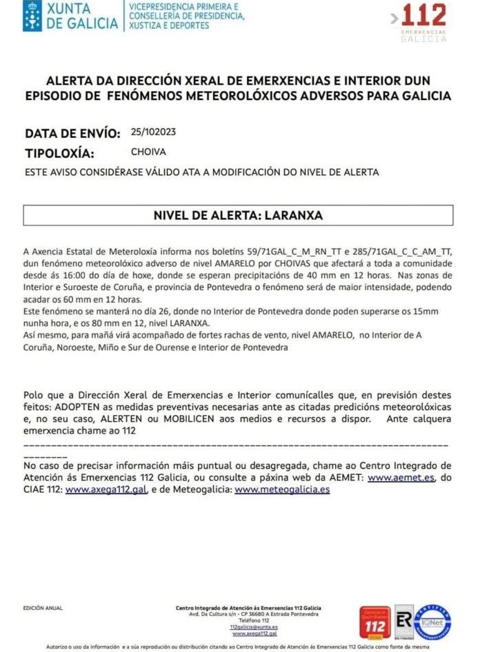 Desde las cuatro de la tarde de hoy miércoles, nos encontramos en Galicia y, especialmente en el litoral de nuestra provincia, en situación de alerta naranja porque se esperan lluvias muy intensas que podrían alcanzar los ochenta litros por metros cuadrado en las próximas doce horas lo que supondría un considerable peligro ya que incluso se prevén para el amanecer, aunque en este caso en el interior de la provincia, fuertes vientos.