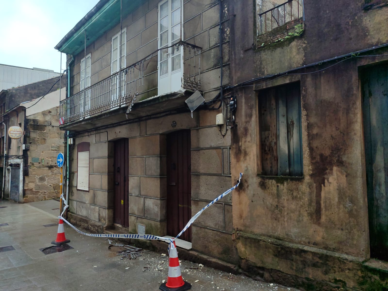 Y a media mañana otro suceso esta vez en la “Rúa da Roda” por donde suelen bajar camiones de reparto de mercancías que se introducen el el Fondo do Saco para que sus conductores realicen su trabajo. La calle es estrecha y con balcones, y tampoco es tan difícil que un repartidor tenga la mala suerte de calcular mal y llevarse por delante un poco de u balcón en este caso de la antigua panadería establecida en ese lugar. Aquí solo hay que lamentar daños en el balcón y seguramente en el gálibo del vehículo, además del disgusto lógico del repartidor en cuestión.