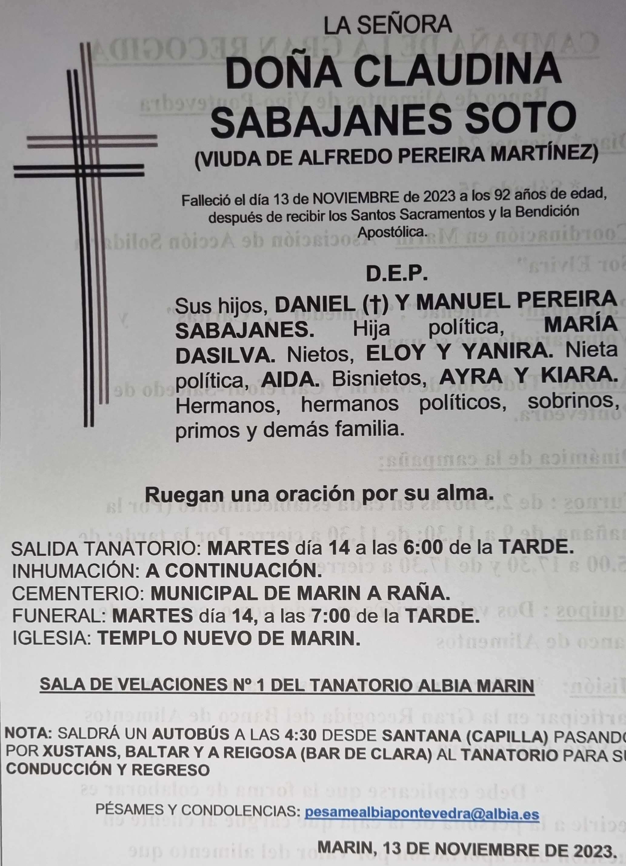 La Funeraria Albia comunica que en su tanatorio de Marín se velan los restos mortales de la vecina de Marín Doña Claudina Sabajanes Soto. fallecida hoy lunes día 13 de noviembre a la edad de 92 años, hasta el momento de su traslado al cementerio de A Raña las SEIS de la tarde, de mañana MARTES, día 14, para su inhumación con posterior celebración de la Misa Funeral en el Nuevo Templo Parroquial a las SIETE de la tarde.D.E.P.