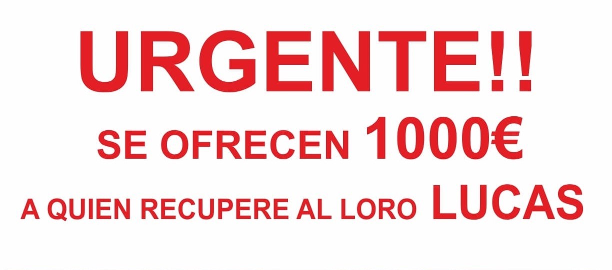 Por eso, haciendo u considerable último esfuerzo, se ha repartido este cartel en el que se comprometen a abonar mil euros a quien les devuelva el loro con lo que recuperaría la sonrisa su propietaria. A ver si hay suerte.