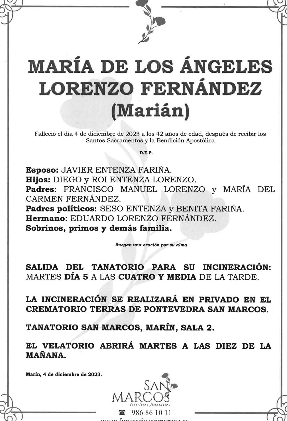 María de los Ángeles Lorenzo Fernández “Marián”, enfermera de profesión, -trabajadora del hospital de día en Montecelo-, hermana del concejal socialista Eduardo Lorenzo y miembro de una histórica saga de comerciantes marinenses falleció ayer, muy lamentablemente, a la edad de 42 años, despues de sufrir complicaciones totalmente inesperadas que la llevaron a ingresar de urgencia después de haber sufrido, según ha informado su familia a Carriola, un cuadro de Gripe A la pasada semana.