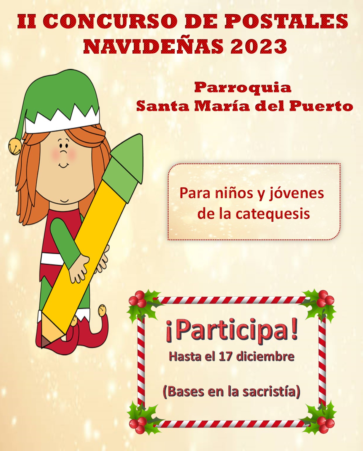 Igualmente y destinado a los niños y jóvenes de la catequesis, se convoca otro concurso desde la misma parroquia de postales que deberán ser entregadas como fecha límite el día 17 de este mes.