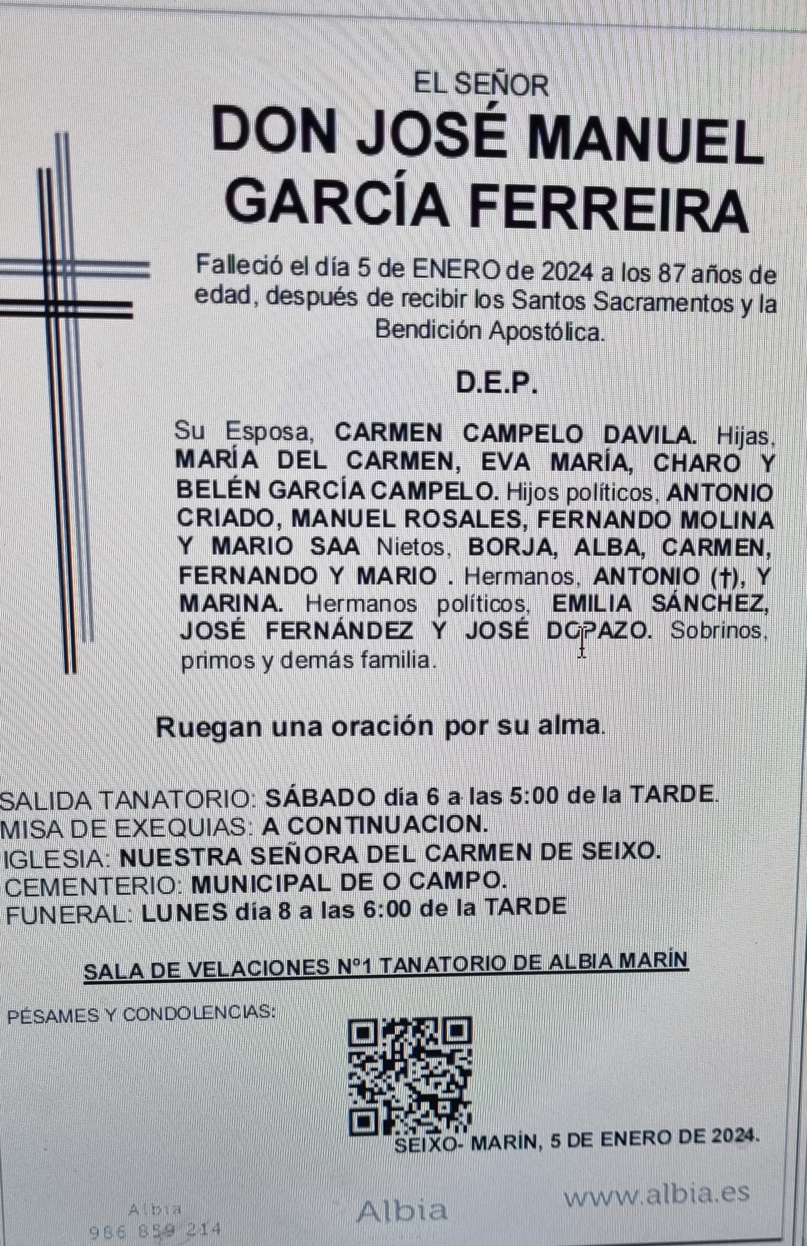 La Funeraria Albia comunica que, en la sala número 1 del Tanatorio Albia en Marín, se velan los restos mortales de Don José Manuel García Ferreira, fallecido hoy, día 5 de Enero a la edad de 87 años, hasta el momento de su traslado que se efectuará a las cinco de la tarde de mañana sábado, día 6, hacia el templo parroquial de Seixo donde será la misa de exequias previa a su traslado al cementerio municipal de Campo. Asimismo comunica que, el funeral por su alma será el lunes día 8, a las seis de la tarde en el mismo templo. DEP