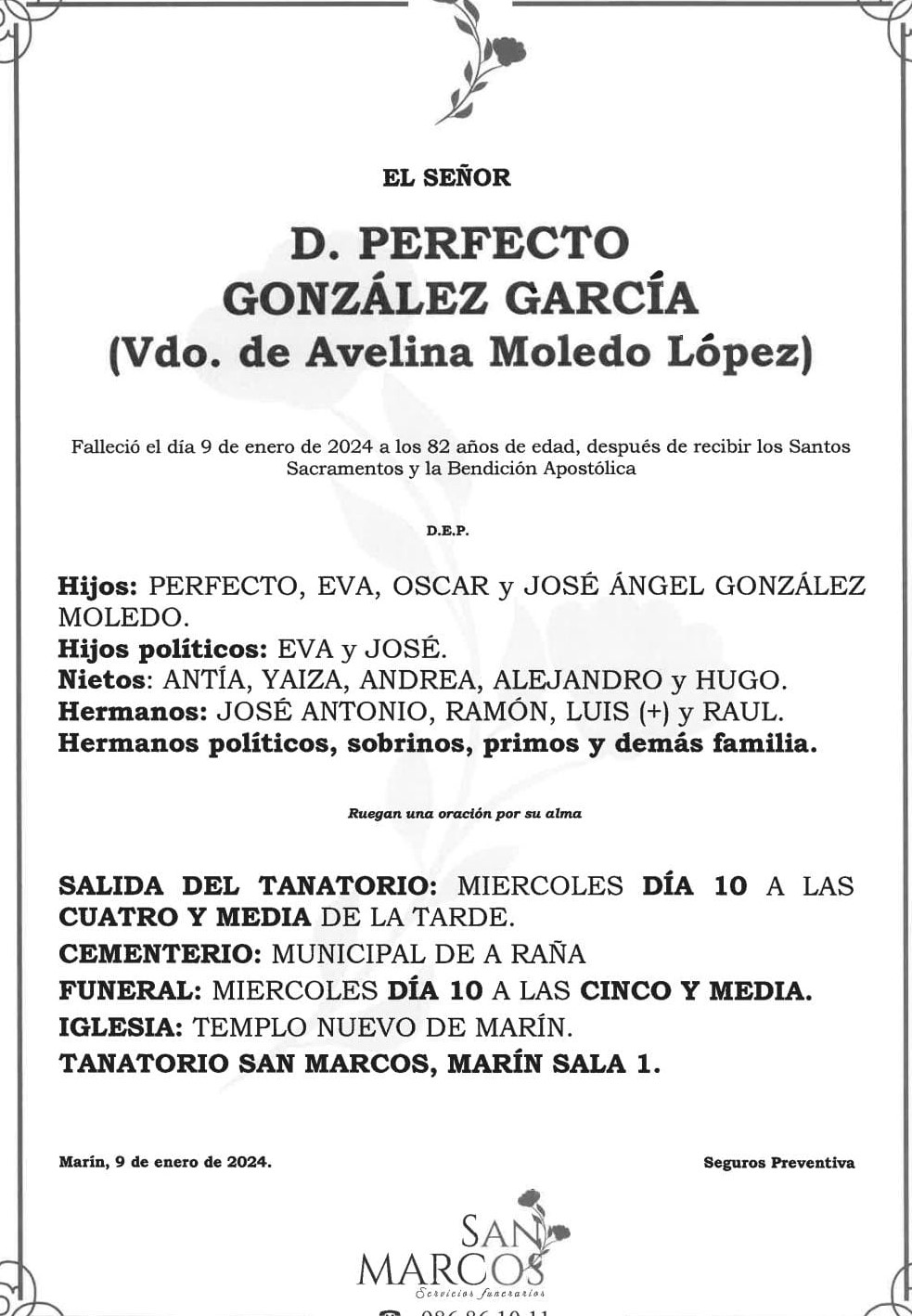 La Funeraria San Marcos comunica que, en la sala número 1 de su Tanatorio en Marín, se velan los restos mortales de D. Perfecto González García, fallecido hoy, día 9 de Enero a la edad de 82 años, hasta el momento de su traslado que se efectuará a las cuatro y media de la tarde de mañana miércoles, día 10 hacia el cementerio municipal de A Raña donde recibirá cristiana sepultura. Asimismo comunica que,el funeral por su alma será también mañana miércoles día 10, a las cinco y media de la tarde en el Nuevo Templo de Marín. DEP.