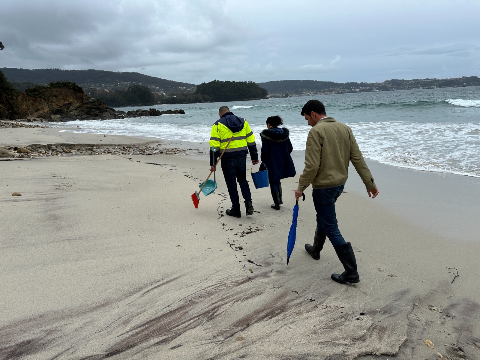 “Os concelleiros Marián Sanmartín e Pablo Novas xunto co persoal de limpeza do Concello, fixeron pola mañá a nova ronda de supervisión e vixiancia aparcendo restos de verquido de pellets de plàstico nestes dous areais.