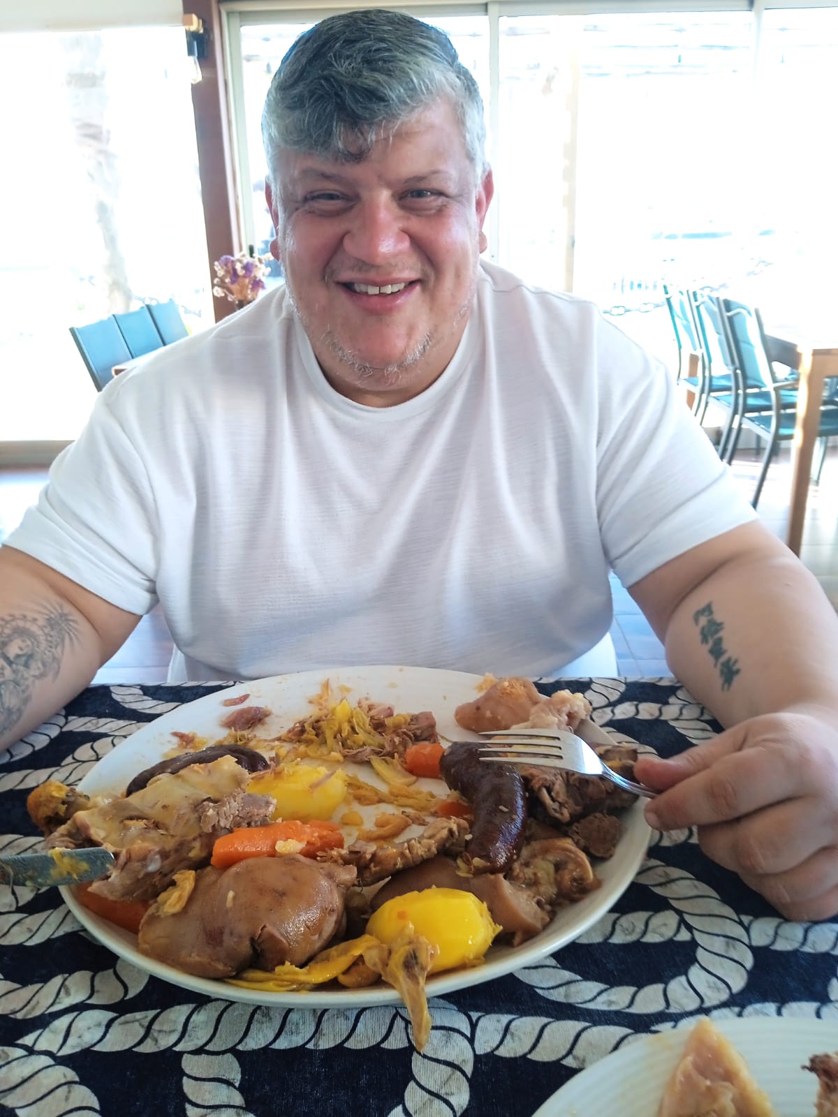 ¡¡¡Huy!!!, por solo trescientos gramos se ha quedado fuera de tiempo este participante en las “Crónicas Carnívoras” de la Cantina del Muelle ya que hay que comerse un cocido de tres kilos antes de una hora para acceder al premio final que se dará al que más rebaje el tiempo de los sesenta minutos