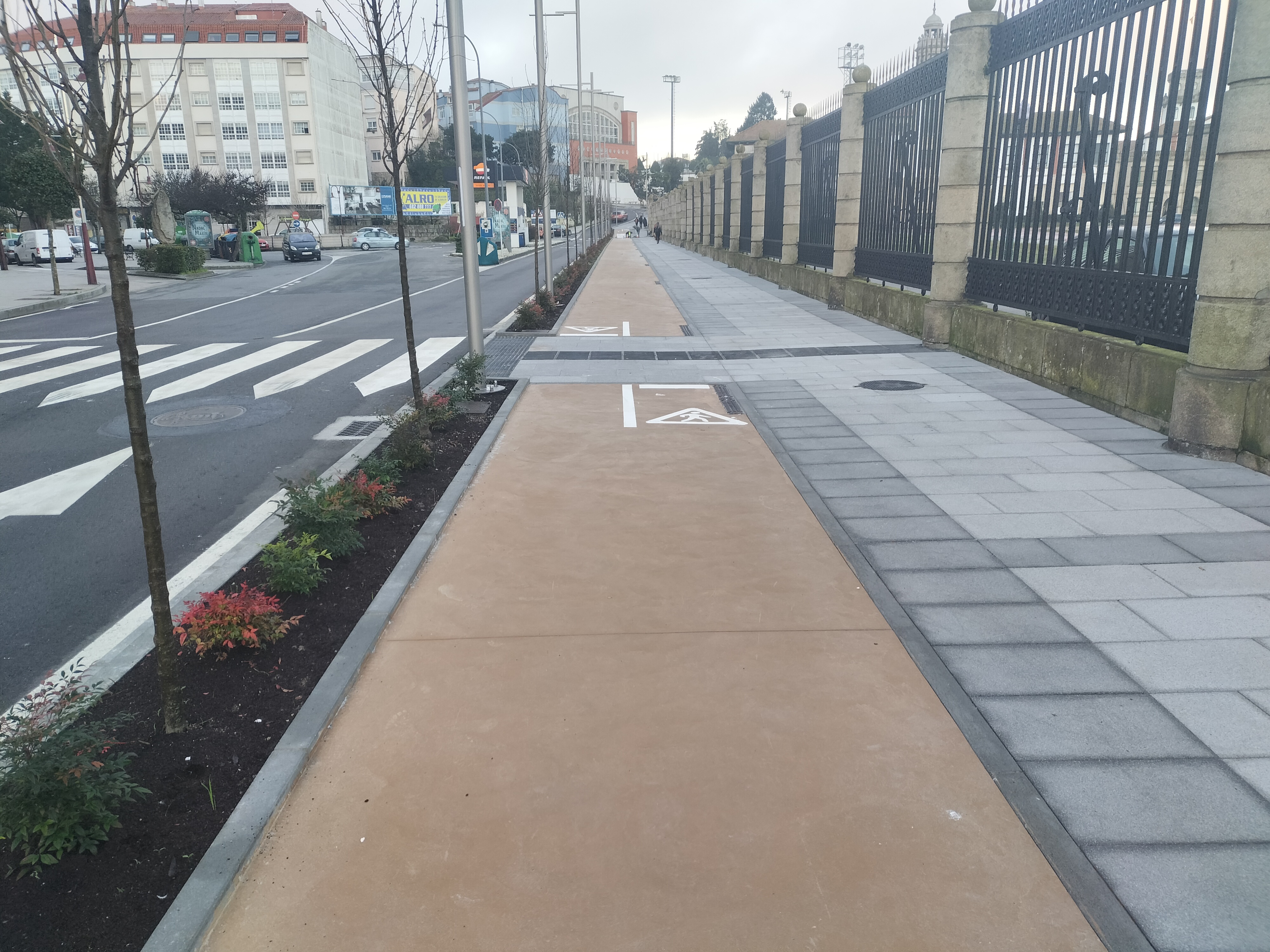 Manuel Pazos, al referirse a estas dos obras, una que va desde el portalón Carlos I de la ENM hacia el Paseo Marítimo y, la otra, que va desde el mismo punto de origen hasta la calle O Forte, considera que “parecen realizadas por ayuntamientos diferentes ya que, una de ellas, la que va dirección a las playas, se construyó con una acera de plaqueta, dispone de carril bici y una pequeña zona ajardinada. Y, la otra, construida a escasos 50 metros es totalmente diferente”