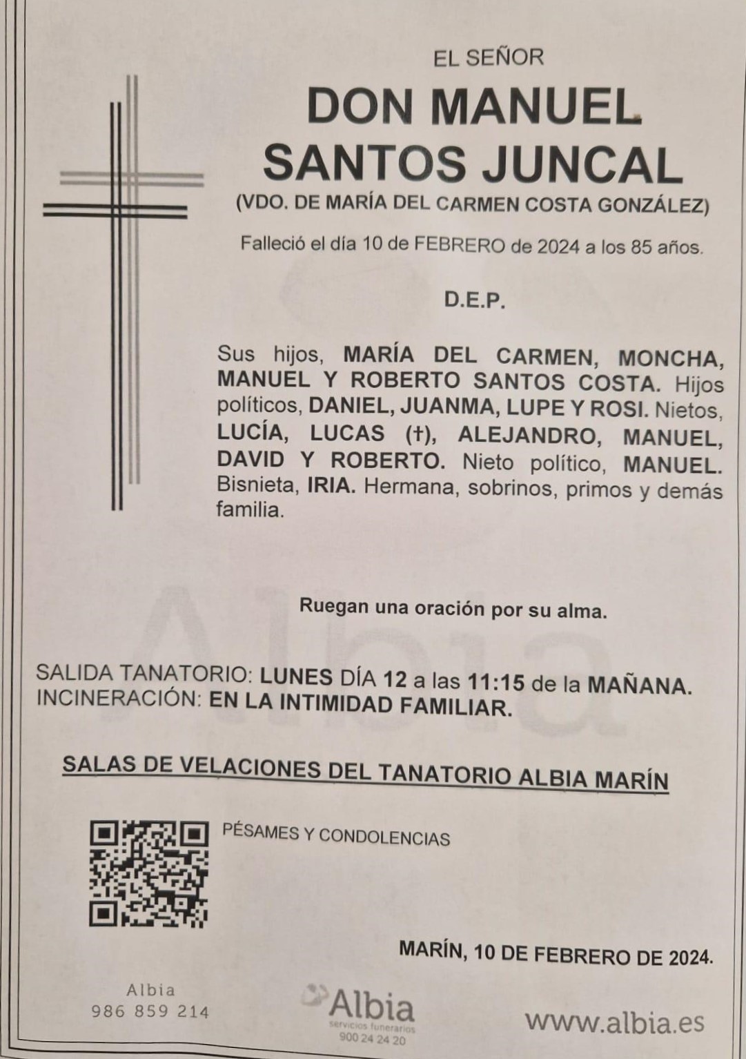La Funeraria Albia informa que, en la sala de velaciones de su tanatorio Albia-Marín se encuentran los restos mortales de Manuel Santos Juncal, fallecido hoy sábado día 10, hasta el momento de su traslado el lunes día 12 a las 11,15 de la mañana para su incineración en la intimidad familiar.