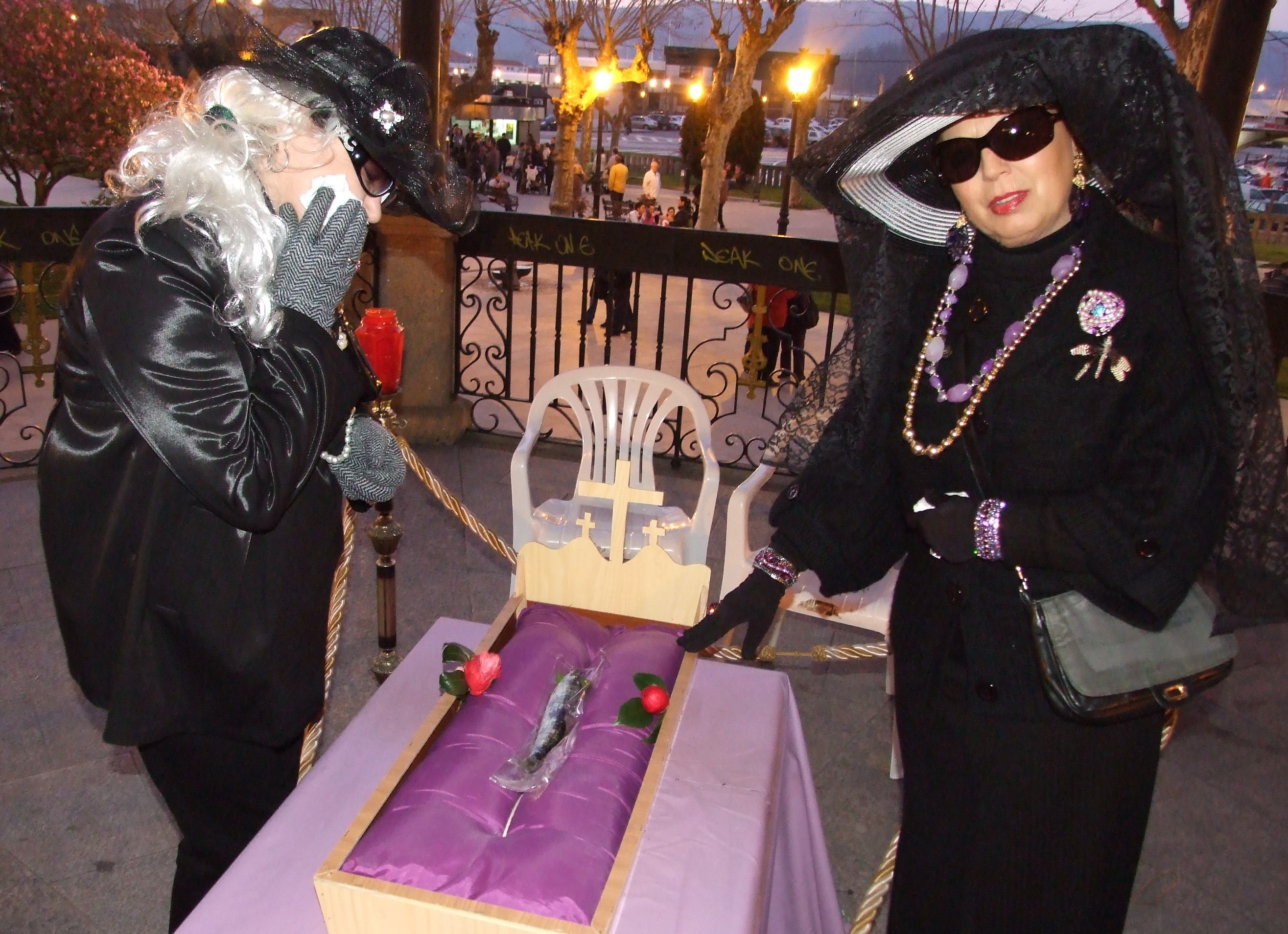 Detrás, grupos de viudas, rigurosamente enlutadas, portando coronas, caminaban mientras proferían lastimosos ayes, quejas y lamentos. Por fin, apareció el catafalco portado a hombros por cuatro encapuchados revestidos de túnicas blancas y negras. A un lado y al otro colgaban dos coronas de laurel. Cuatro farolillos, uno en cada esquina, adornaban el pequeño ataúd decorado con delfines, pulpos y sardinas de color azul. Sobre el naranja de las telas fúnebres que cubrían el catafalco, caía una cinta de color negra con letras doradas. Unos pasos más atrás, bajo palio, aparece un grotesco obispo barrigudo y narigudo, acompañado de un cura y un monaguillo, portando uno una bacinilla y una escobilla del váter; el otro, un cuadro de una parrilla invertida. Cada cual con sus correspondientes pelucas: una blanca, la otra pelirroja, con dos antenas, una a cada lado (dos pajitas para absorber refrescos); impartiendo bendiciones a diestro y siniestro con la mano izquierda, en la que lleva un enorme anillo con luz. Su correspondiente báculo y medallón con cadena.