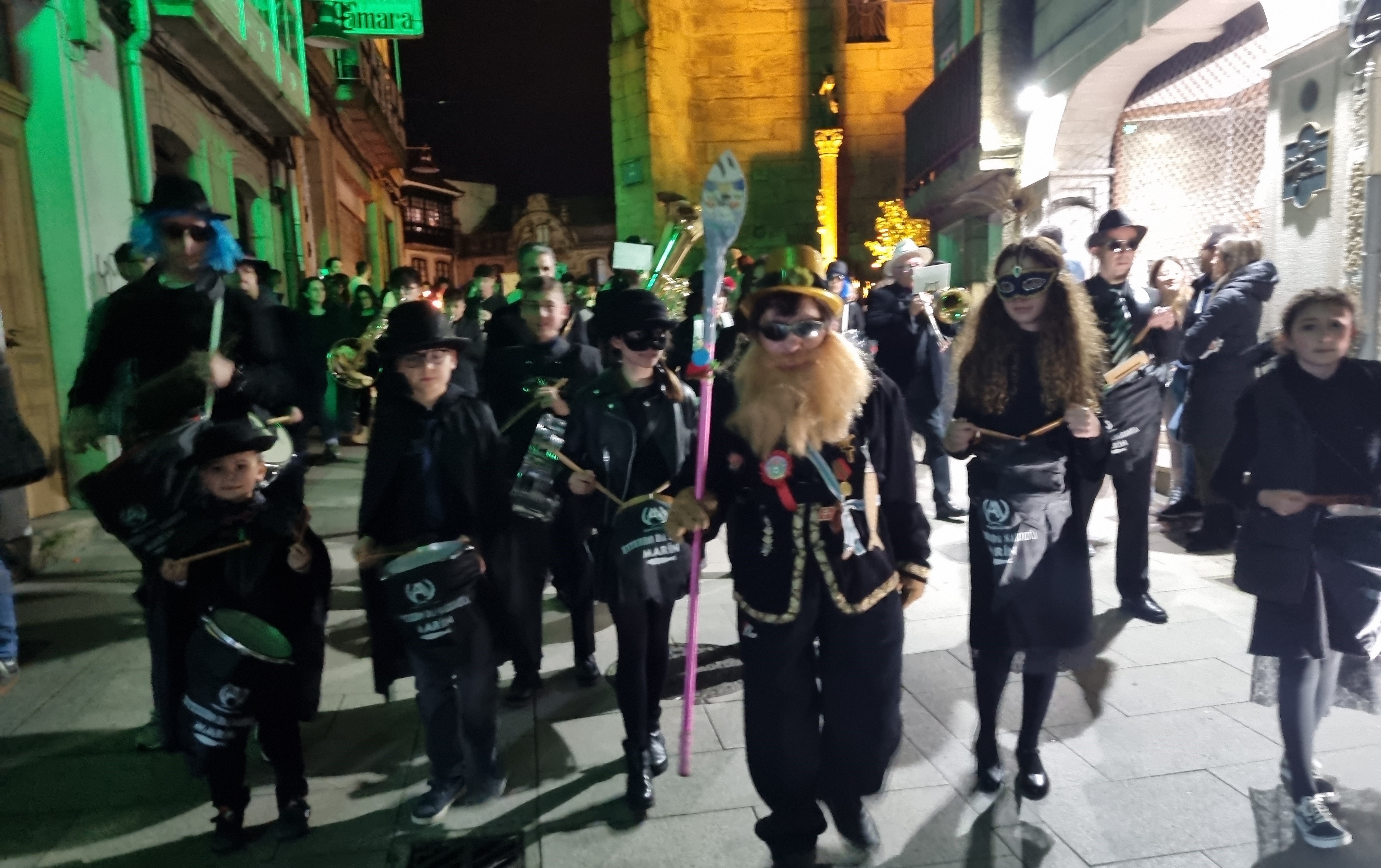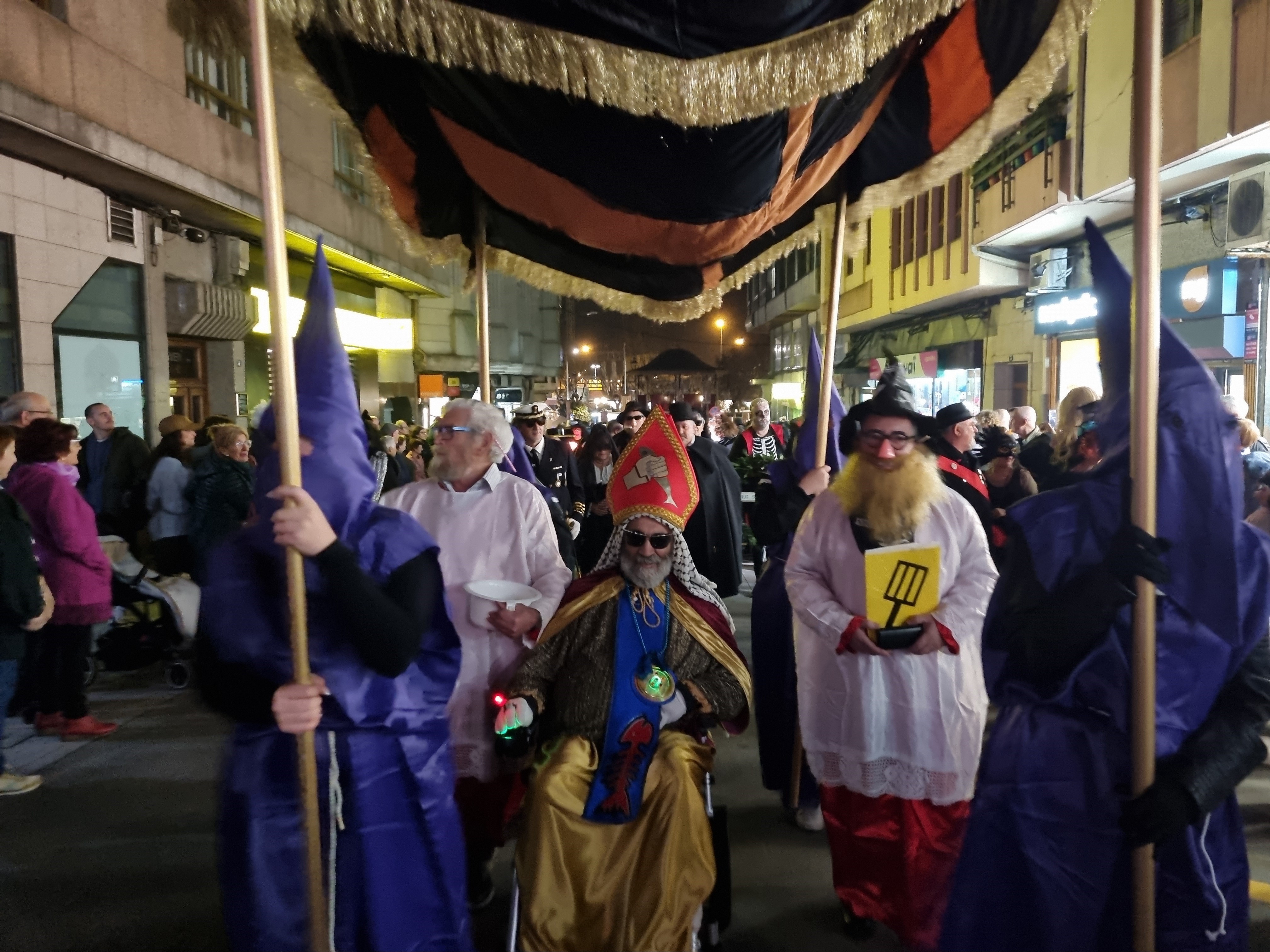 Y a las ocho en punto, partió la comitiva precedida por los cuernos, los estandartes y el ardiente azufre, a los sones de la banda do Enterro con ssu director “Boneti” al frente, domando el rumbo Jaime Janer arriba para retornar por Doctor Touriño y llegar a la Plaza del Reloj donde se encontraba instalado el recinto del sermón pronunciado por el “frade maior” y la letanía y sus bendiciones, por el “Bispo” que inició la retahíla con lo de “un ollón...dous ollóns...tres...y así hasta cinco (que por aquí suena “sinco”) con respuesta de los cientos de personas que presenciaban el acto, para seguir con la “ladaíña”, cuya composión es centenaria, invocando a cuanto peixe, bueno o malo hay en el mar.