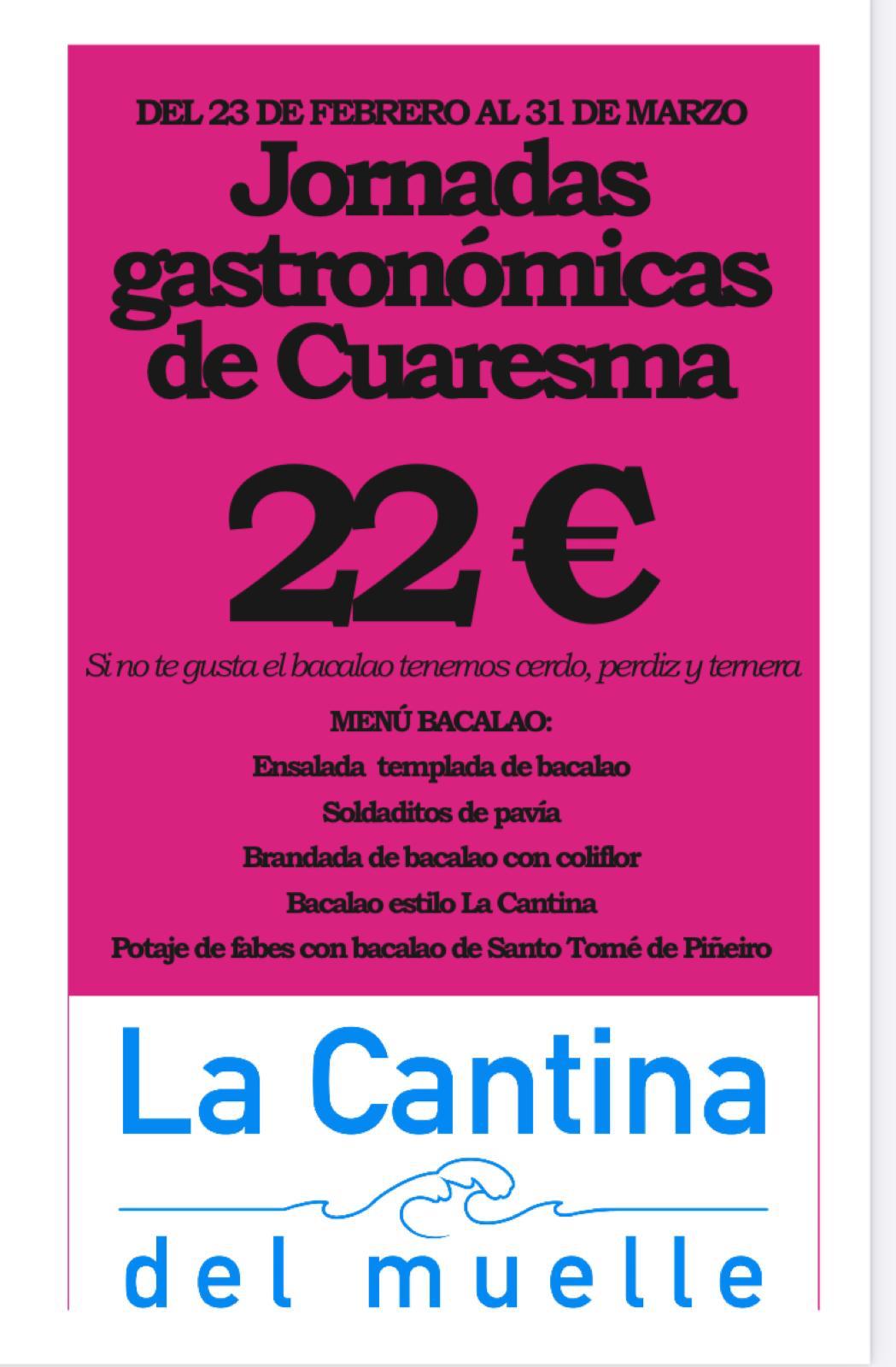 El menú del bacalao consiste en cinco platos en los que se elabora este pescado de diferentes formas. “Ensalada templada de bacalao”, “Soldaditos de Pavía”, “Brandada de bacalao con coliflor”, “Bacalao estilo La Cantina” y “Fabes de Santo Tomé de Piñeiro con bacalao”.