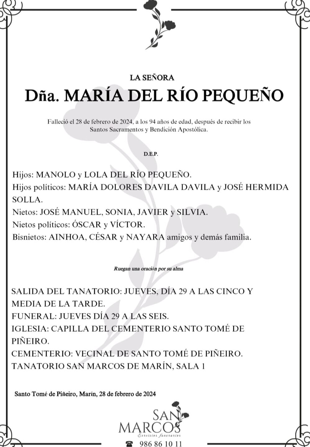 La Funeraria SAN MARCOS informa que, en la sala de velaciones número 1 de su tanatorio de Marín se encuentran los restos mortales de Doña María del Río Pequeño fallecida hoy el día 28 de febrero, hasta el momento de su traslado, mañana jueves día 29 a las cinco y media de la tarde para su inhumación en el cementerio de Santo Tomé de Piñeiro.