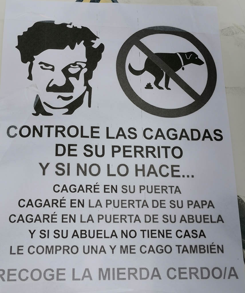 Considerando que quizás son un poco exageración estas afirmaciones, sí es cierto que en determinadas zonas de Marín pueden observarse las aceras llenas de suciedad, fundamentalmente animal, debido a la falta de civismo de algunos. y al hilo de este asunto hay que decir que algunos vecinos de estas calles se han cansado de soportar este tipo de inconvenientes, y han empezado a aparecer carteles contra estos comportamientos, uno incluso parafraseando al narcotraficante colombiano Pablo Escobar. Los carteles son un poco de mal gusto, es cierto, pero dado que existe el malestar vecinal nos vemos en la conveniencia de reflejarlo en la fotodenuncia de hoy.