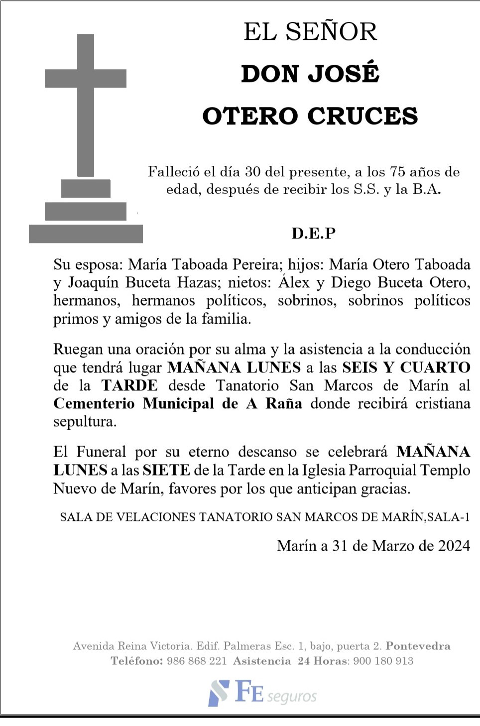 La Fe informa que, en la sala de velaciones número 1 del tanatorio San Marcos de Marín se encuentran los restos mortales de D. José Otero Cruces, fallecido ayer día 30 de marzo, hasta el momento de su traslado, mañana lunes día 1 de abril a las seis y cuarto de la tarde, desde el tanatorio al cementerio municipal de A Raña donde recibirá cristiana sepultura