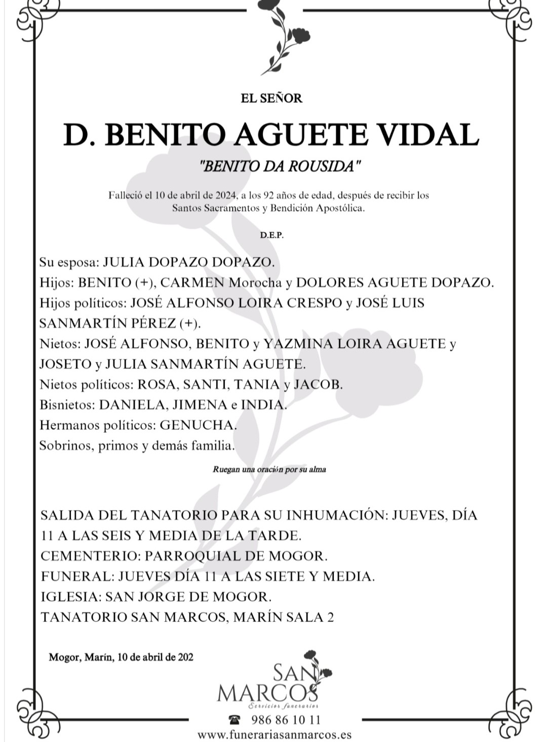 La funeraria SAN MARCOS informa que en la sala de velaciones número 2 del tanatorio en Marín se encuentran los restos mortales de Benito Aguete Vidal, fallecido hoy día 10 de abril, hasta el momento de su traslado, mañana jueves día 11 de abril a las seis y media de la tarde desde el tanatorio al cementerio parroquial de Mogor donde se procederá a su inhumación. Asimismo informa que el funeral por el eterno descanso de su alma será a continuación (siete y media de la tarde) en la iglesia de San Jorge de Mogor. D.E.P.