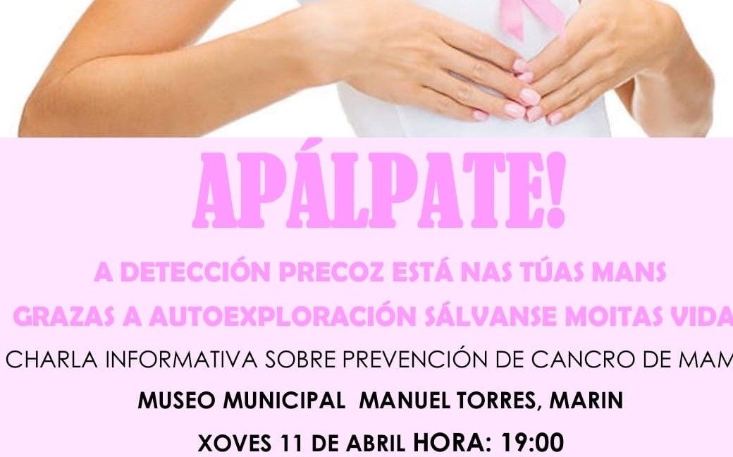 La Asociación de Mullere O Abeiro” organiza es tarde una charla informativa sobre la detección precoz del cáncer de mama contando con la colaboración de la “Asociación de Diagnosticad@s de Cancro de Mama e Xinecolóxico”, y el Concello de Marín, acto que tendrá lugar a las siete de la tarde en el Museo Municipal Manuel TorresAsociación de Diagnosticad@s de Cancro de Mama e Xinecolóxico”.