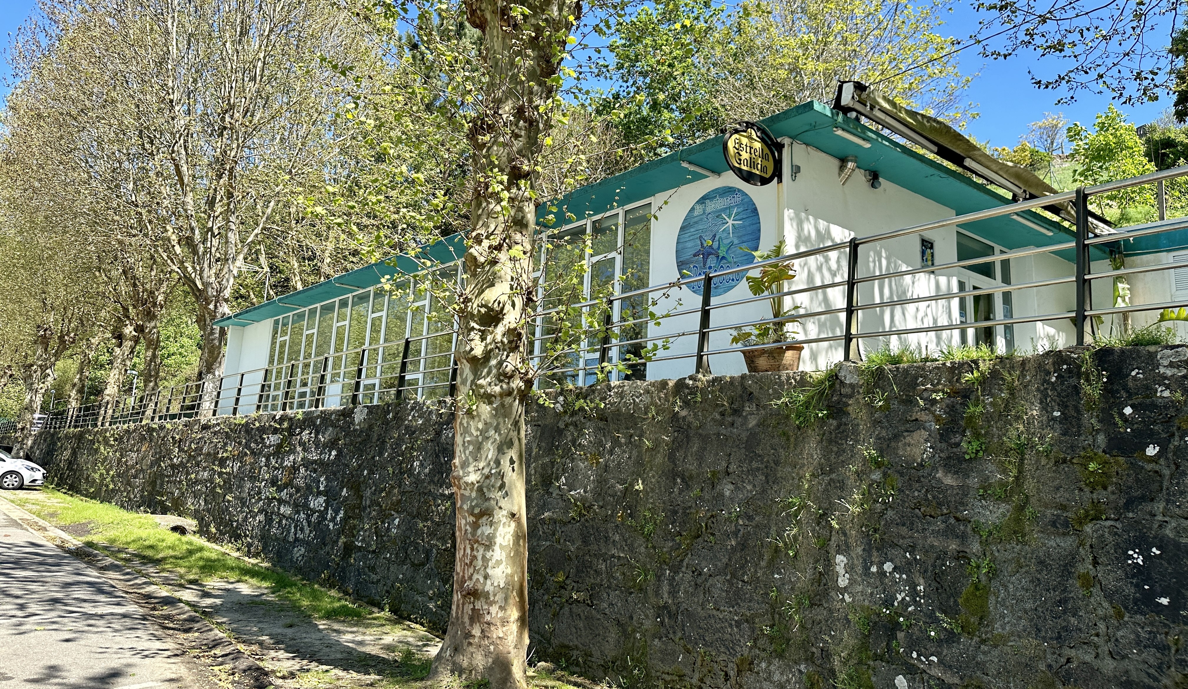 El bar de Portocelo se encuentra ubicado frente a la playa del mismo nombre con separación de la misma por el vial que transcurre en el mismo tramo y cuenta, ademas del inmueble propios de la instalación, con una gran terraza elevada con vistas a la playa