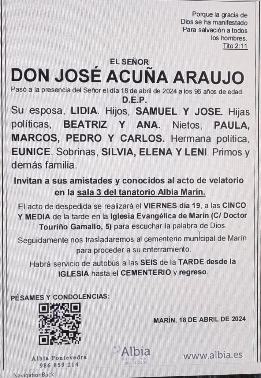 La funeraria Albia informa que en la sala de velaciones número 3 de su tanatorio en Marín se encuentran los restos mortales de Don José Acuña Araujo, fallecido hoy día 18 de abril, hasta el momento de su traslado, mañana viernes día 19 de abril a las cinco y media de la tarde desde el tanatorio a la Iglesia Evangélica de Marín para escuchar la palabra de Dios previamente a su enterramiento en el Cementerio Municipal de A Raña para cuyo acompañamiento habrá servicio de autobuses desde la Iglesia al cementerio y regreso.D.E.P.