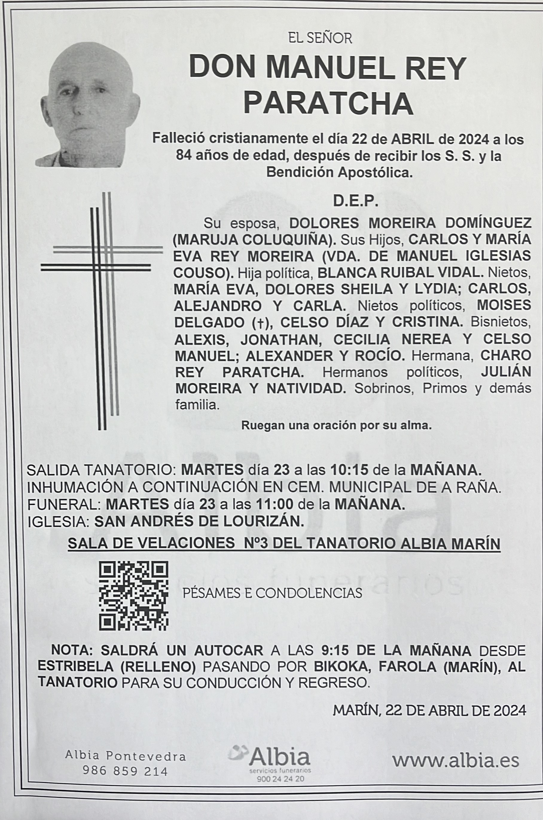La funeraria Albia informa que en la sala de velaciones número 3 de su tanatorio en Marín se encuentran los restos mortales de Manuel Rey Paratcha, fallecido hoy día 22 de abril, hasta el momento de su traslado, mañana martes día 23 de abril a las 10,15 de la mañana, desde el tanatorio al cementerio municipal de A Raña para su inhumación.