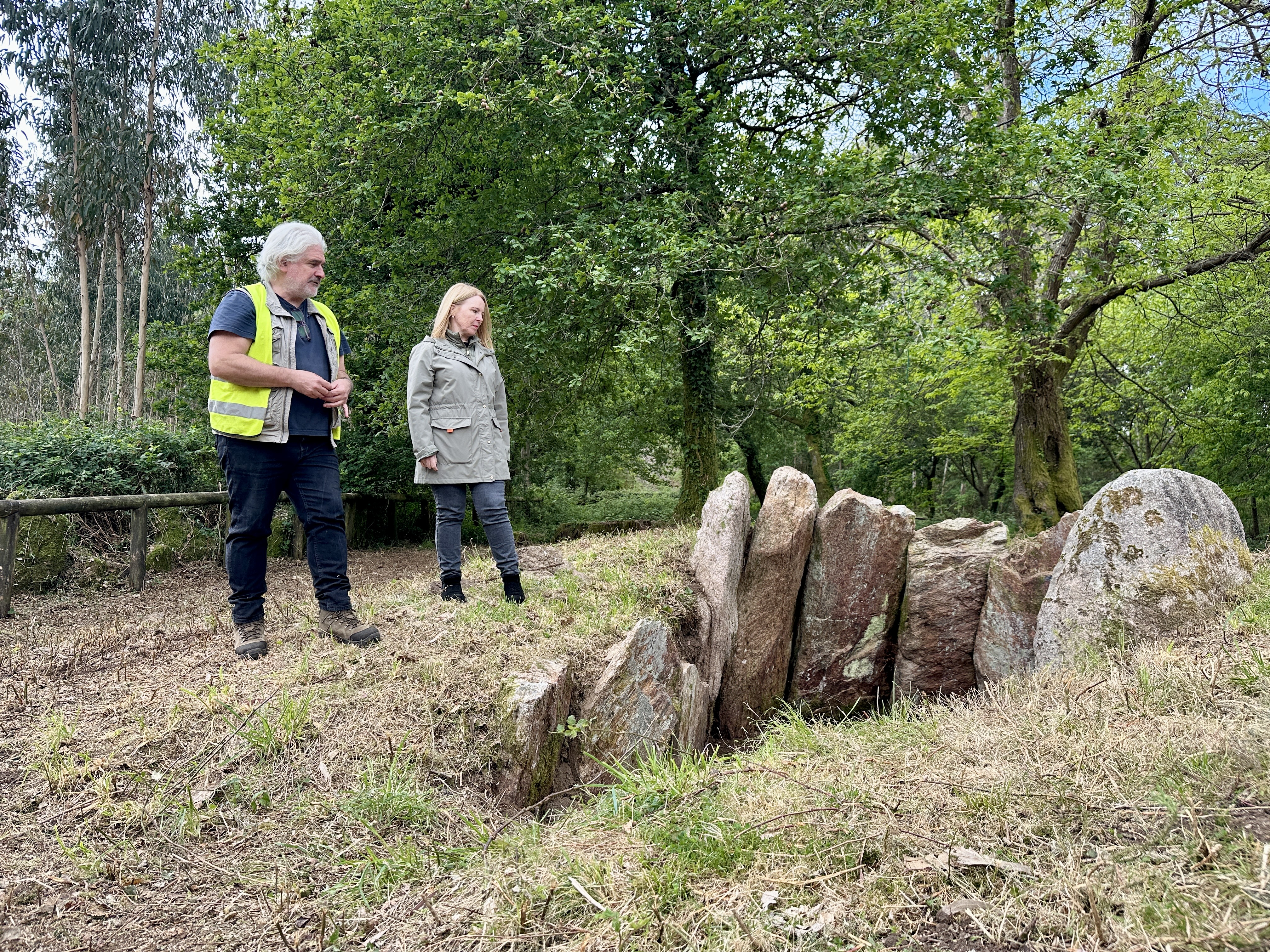 En todas elas - explicó el profesor Castro - estase a actuar no seu desbroce e sinalización A Na de Chan de Xaxán - que fue la que visitaron Castro y Rodríguez ayer- é a máis grande de todas elas, contando con 30 metros de diámetro onde, ademais da retirada da capa máis grosa de vexetación que se sedimenta sobre a superficie da mámoa, estase a desbrozar a man a zona máis delicada da cavidade funeraria”. El experto aseguró que en otra mamoa del recorrido se encuentran grabados del Neolítico y añadió, “Ao longo do percorrido, iranse atopando puntos informativos con debuxos e infografías nas que entender como se construían estas mámoas, como era a vida das sociedades primitivas, os seus ritos e costumes, o por que das localizacións destes restos arqueolóxicos.”
