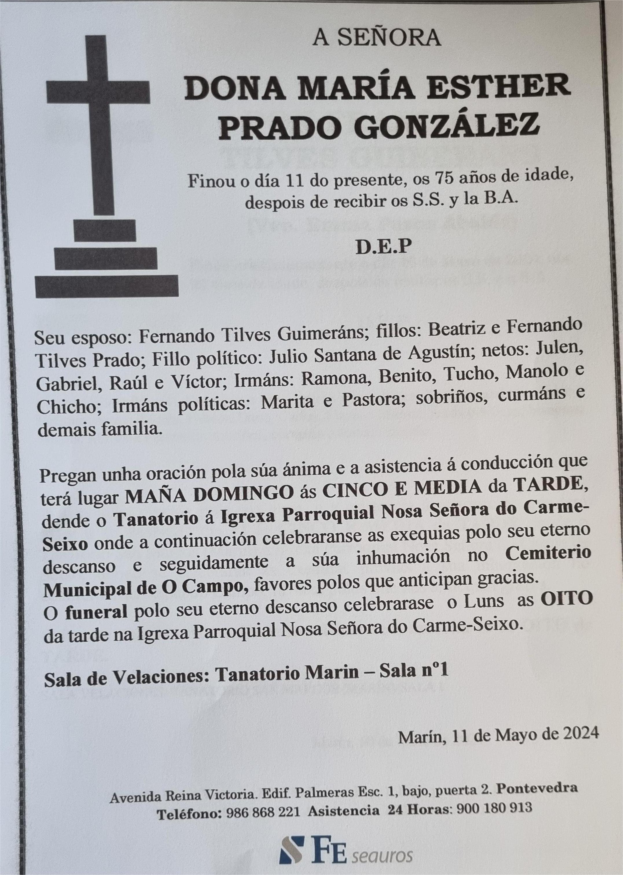 La funeraria LA FE informa que en la sala de velaciones número 1 del Tanatorio Marín se encuentran los restos mortales de Doña María Esther Prado González, fallecida hoy día 11 de mayo, hasta el momento de su traslado, mañana domingo día 12 de mayo a las CINCO Y MEDIA de la tarde del tanatorio a la iglesia de Seixo y, a continuación, al Cementerio Municipal de O Campo para su inhumación.