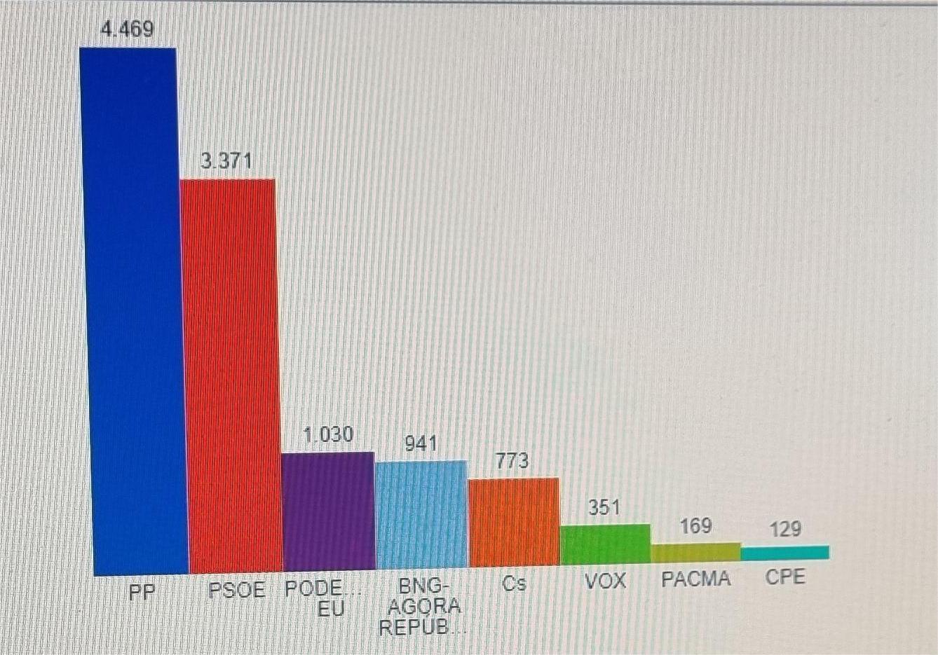 El resultado en aquella ocasión fue favorable al Partido Popular que obtuvo 4.469 votos, un 38,67 % de los votos emitidos y le siguió el PSOE con el 3.371 votos, que era el 29,17 %. En tercera posición se colocó “Podemos.EU” con 1.030 votos y el 8,9% y en la cuarta “BNG-Agora Repúblicas”, que sacó 941 votos, un 8,14%. De ahí para abajo y hasta más de treinta partidos el liza, Ciudadanos, 773; VOX, 351; PCMA 169 y, a partir de ahí con notables diferencias los otros partidos hasta los 32 que componían la oferta electoral en la que había para elegir.
