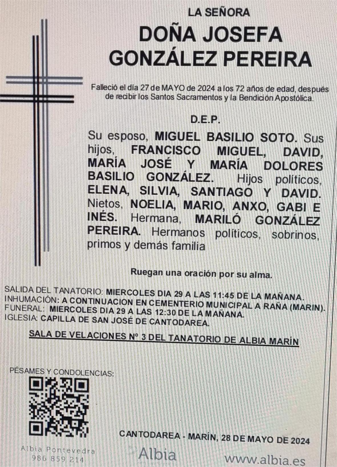 La funeraria Albia comunica que en la sala 3 de su tanatorio en Marín se velan los restos mortales de Dña Josefa González Pereira, fallecida el día 27, hasta el momento de su traslado al cementerio municipal de A Raña que se efectuará mañana miércoles día 29 a las DOCE MENOS CUARTO de la mañana para su inhumación.